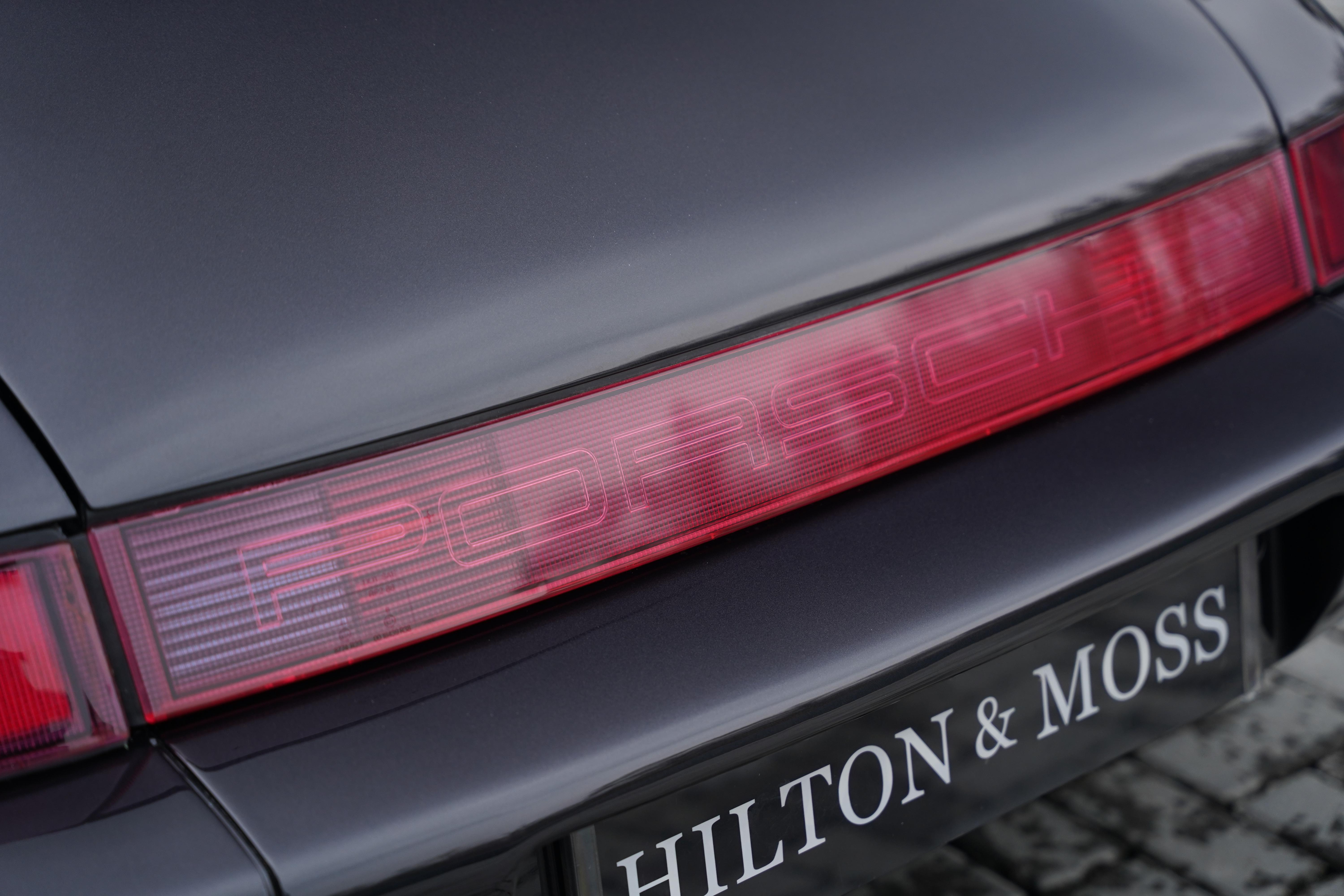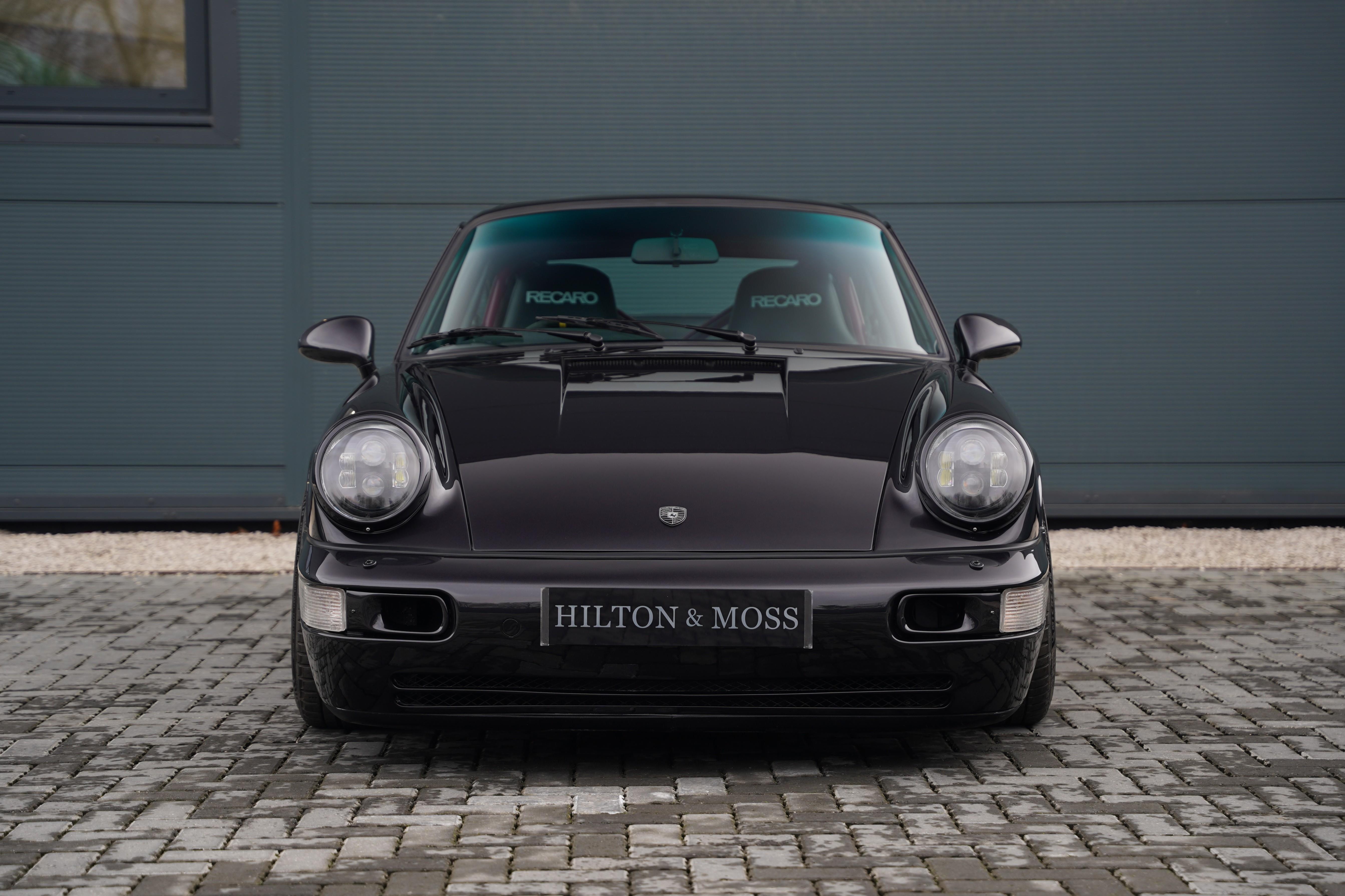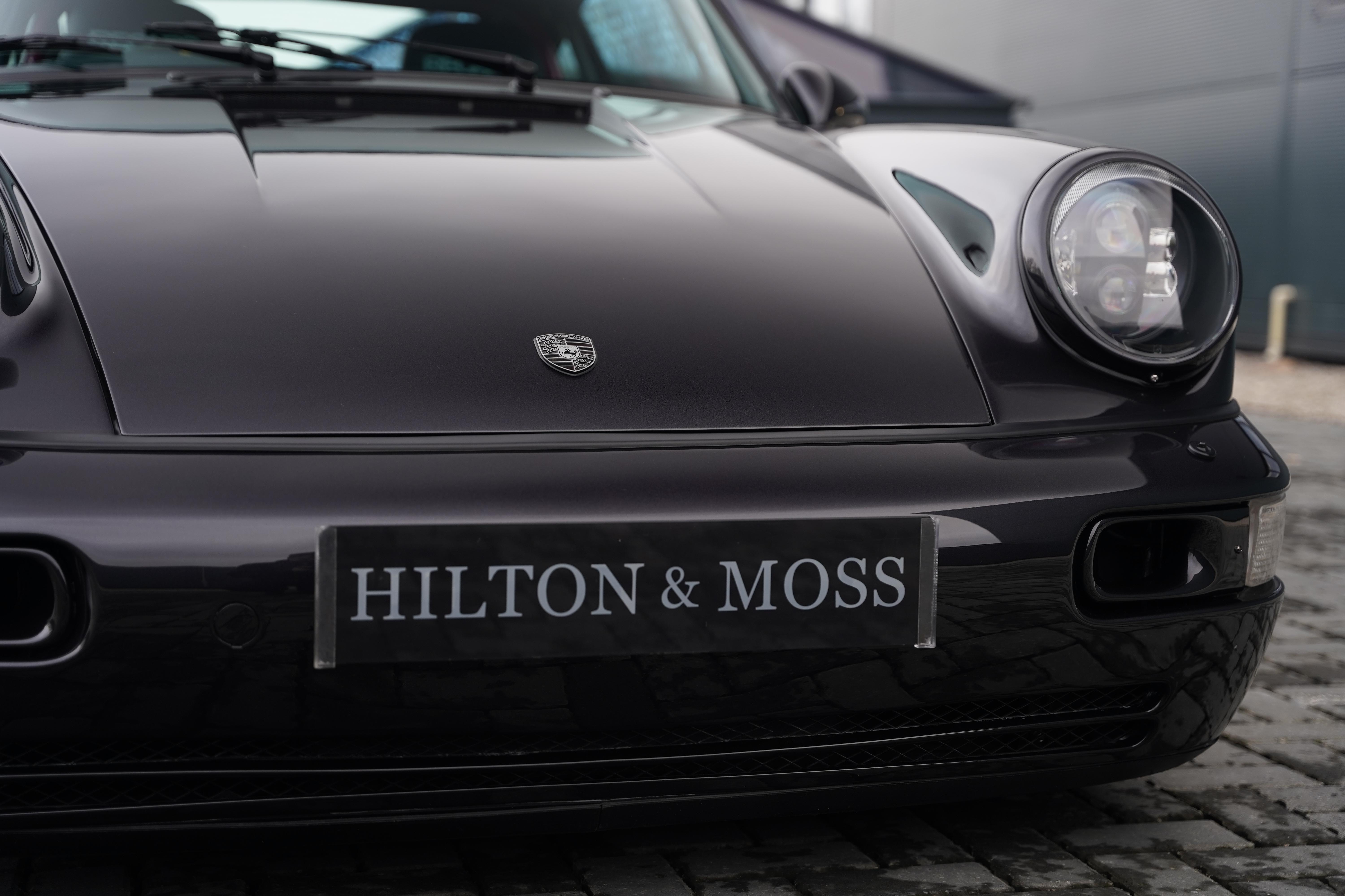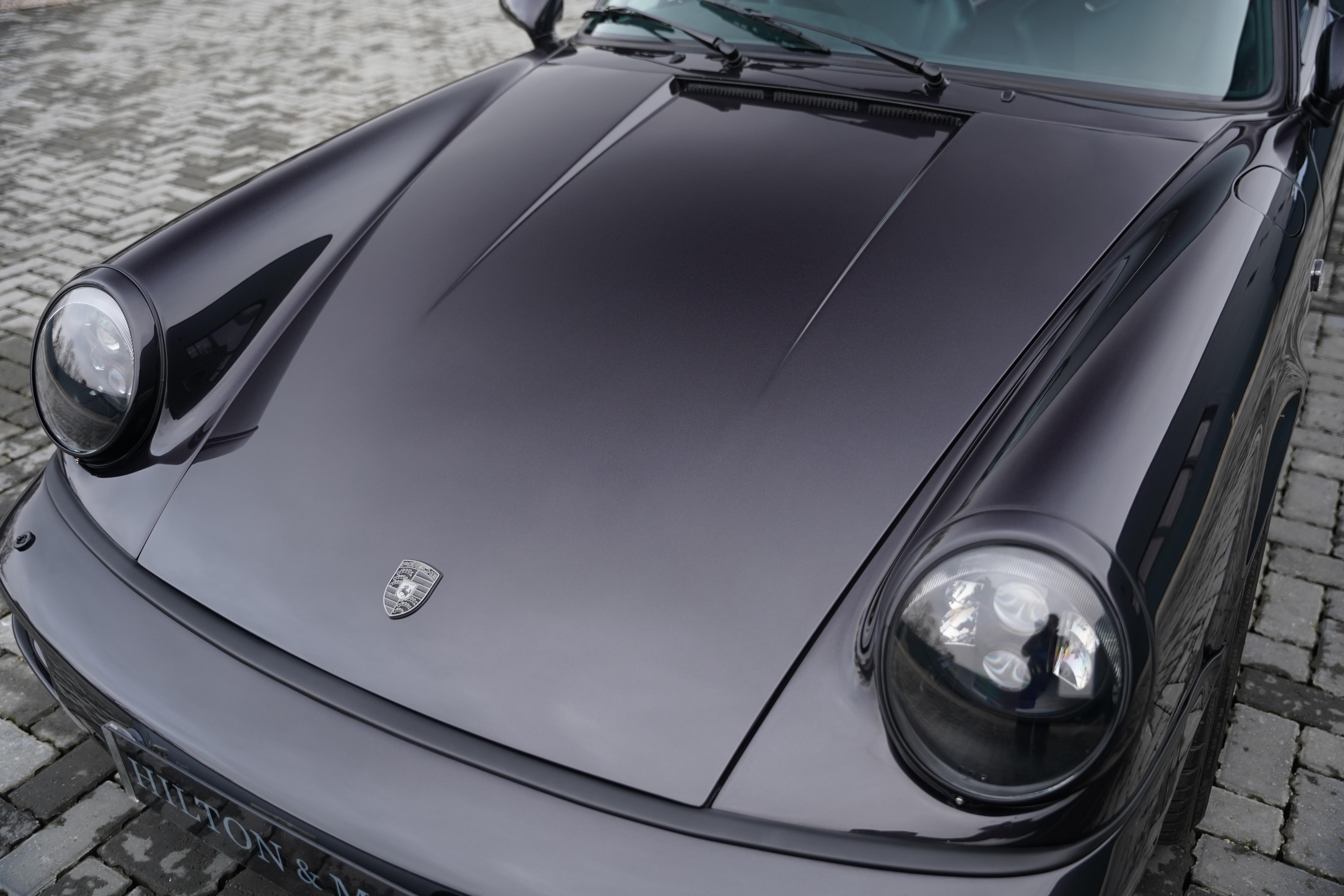 Hilton & Moss are pleased to present this fantastic example, first registered in April 1990. This 964 is fresh from a full external respray by the Hilton & Moss team. Although a fine example already, the previous keeper operated with a ‘no expense spared’ attitude and wanted to ensure this 911 looked better than when it left the factory. The client commissioned a complete ‘panel off’ respray correcting any previous works that had been completed over the last 35 years of the car’s life. Following on from the variety of high end restomods already completed on the vehicle it was decided that the car would be finished in the premium colour of Porsche Basalt Black, a modern colour that carries real depth with an elegant metallic fleck.