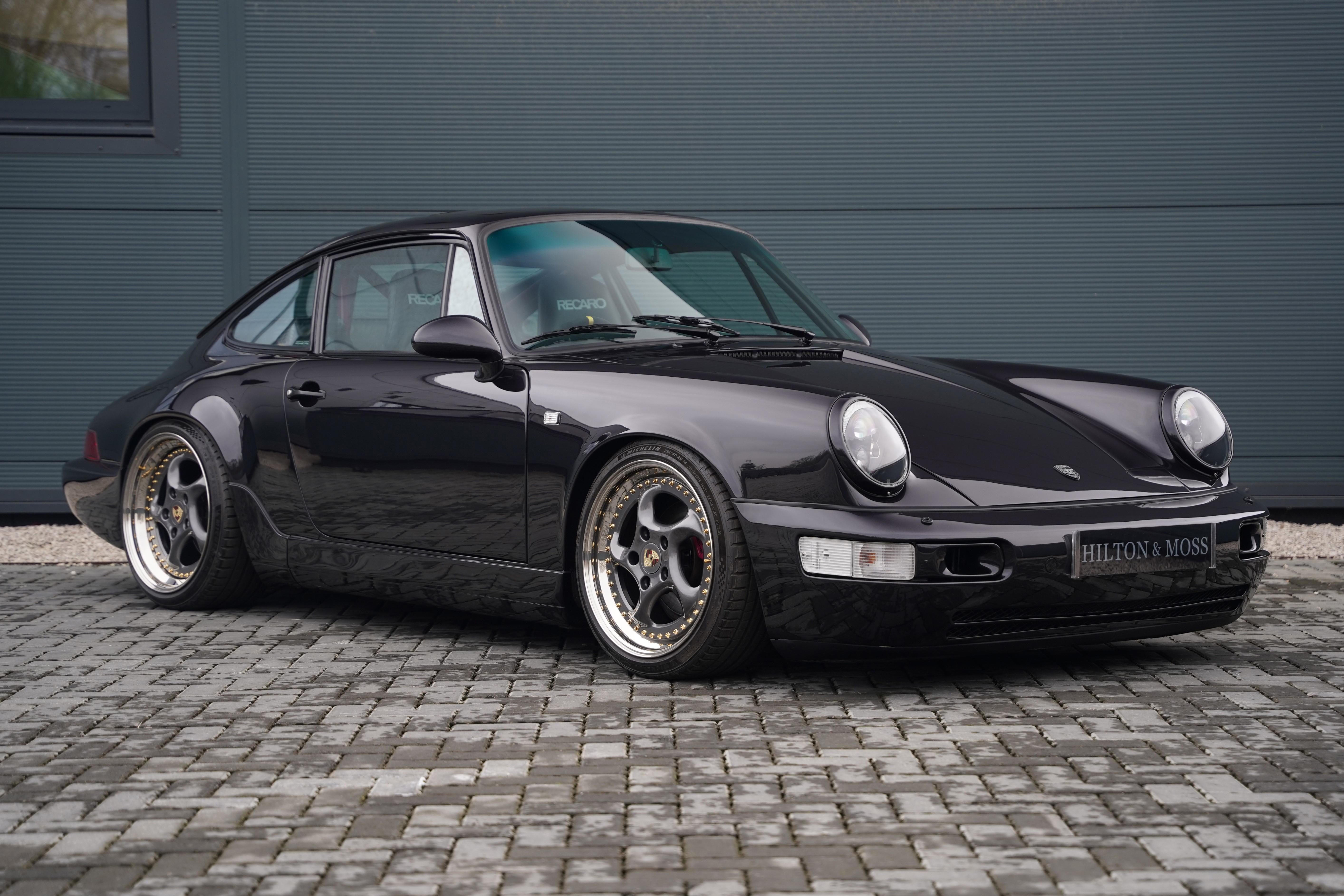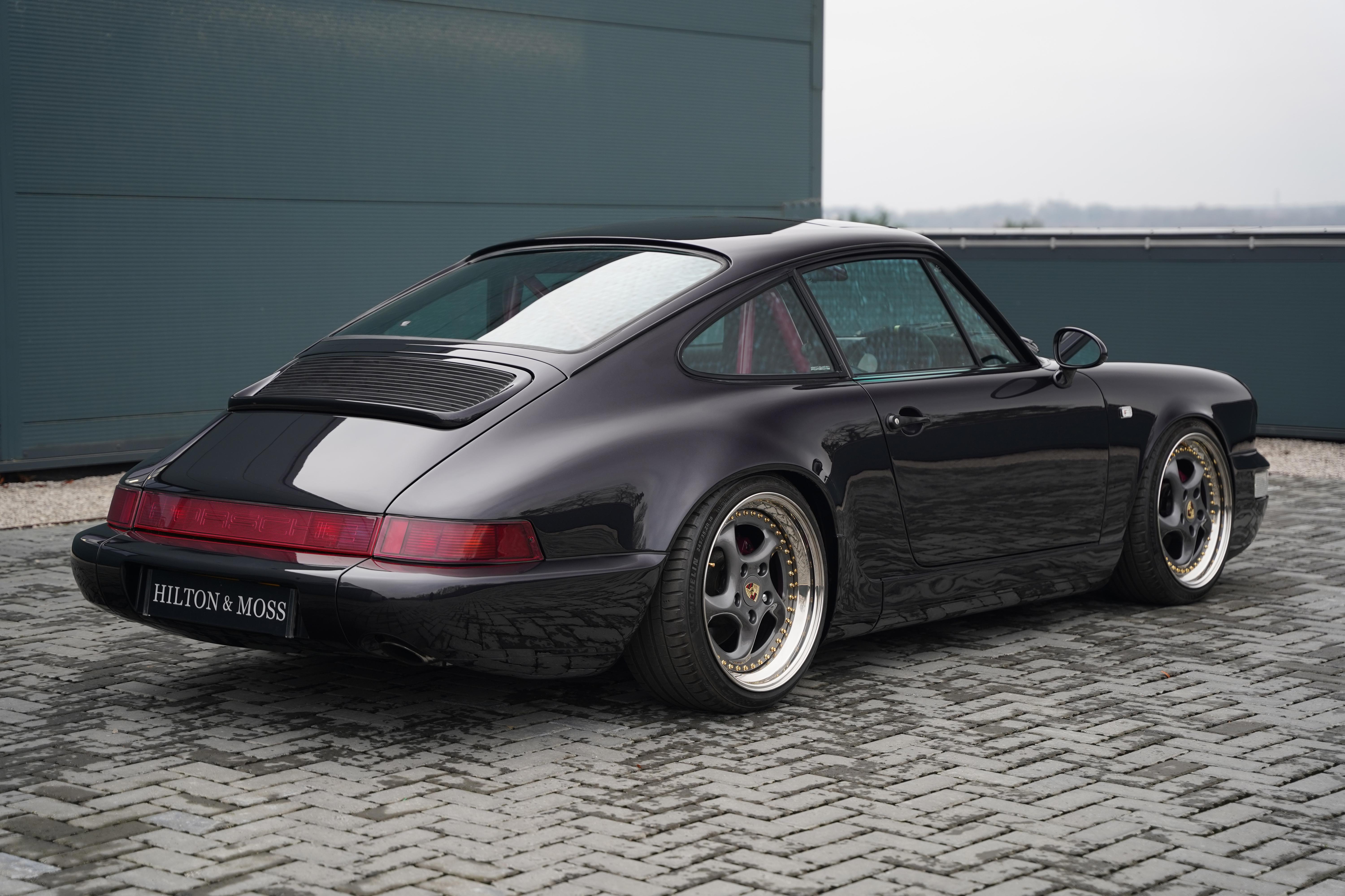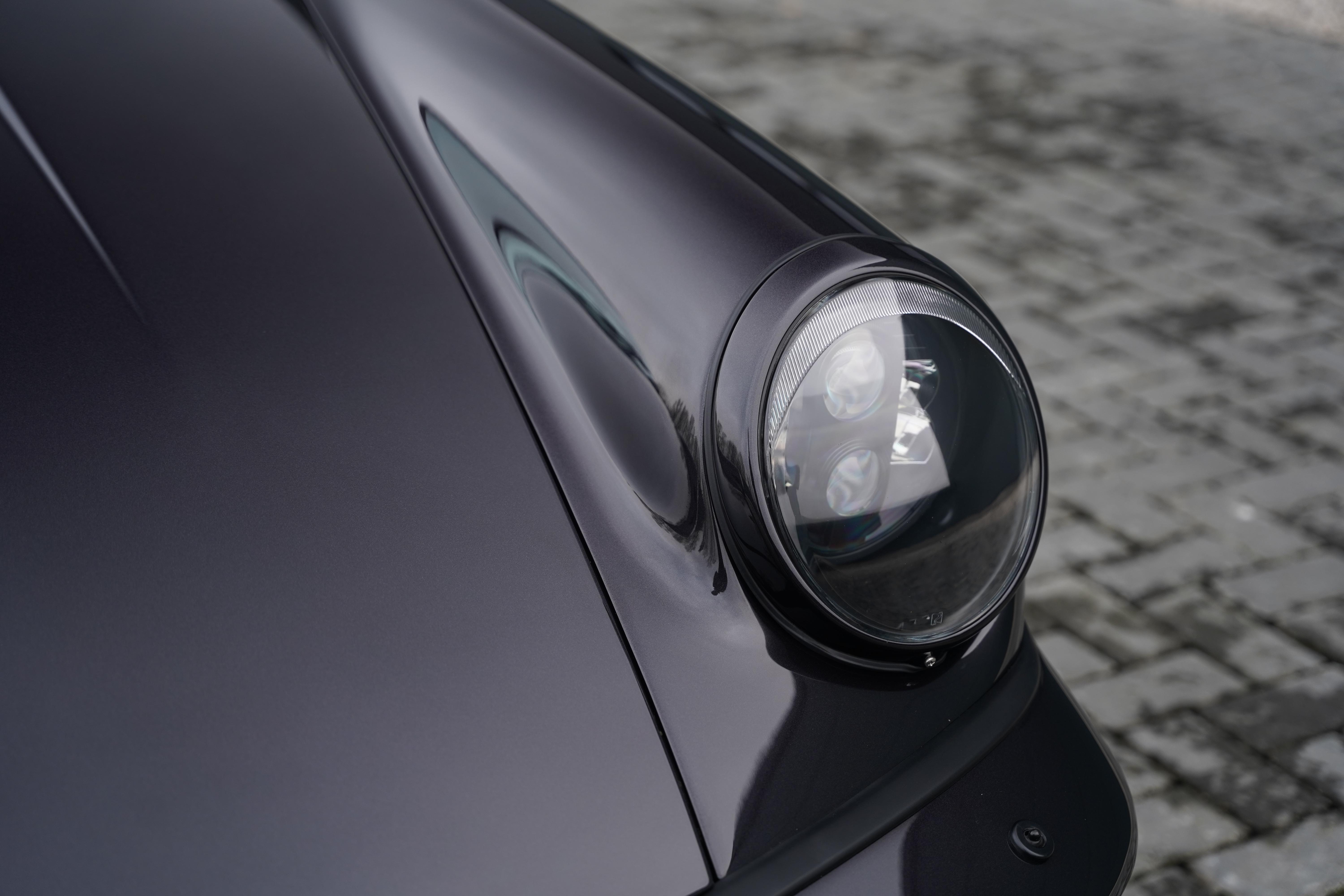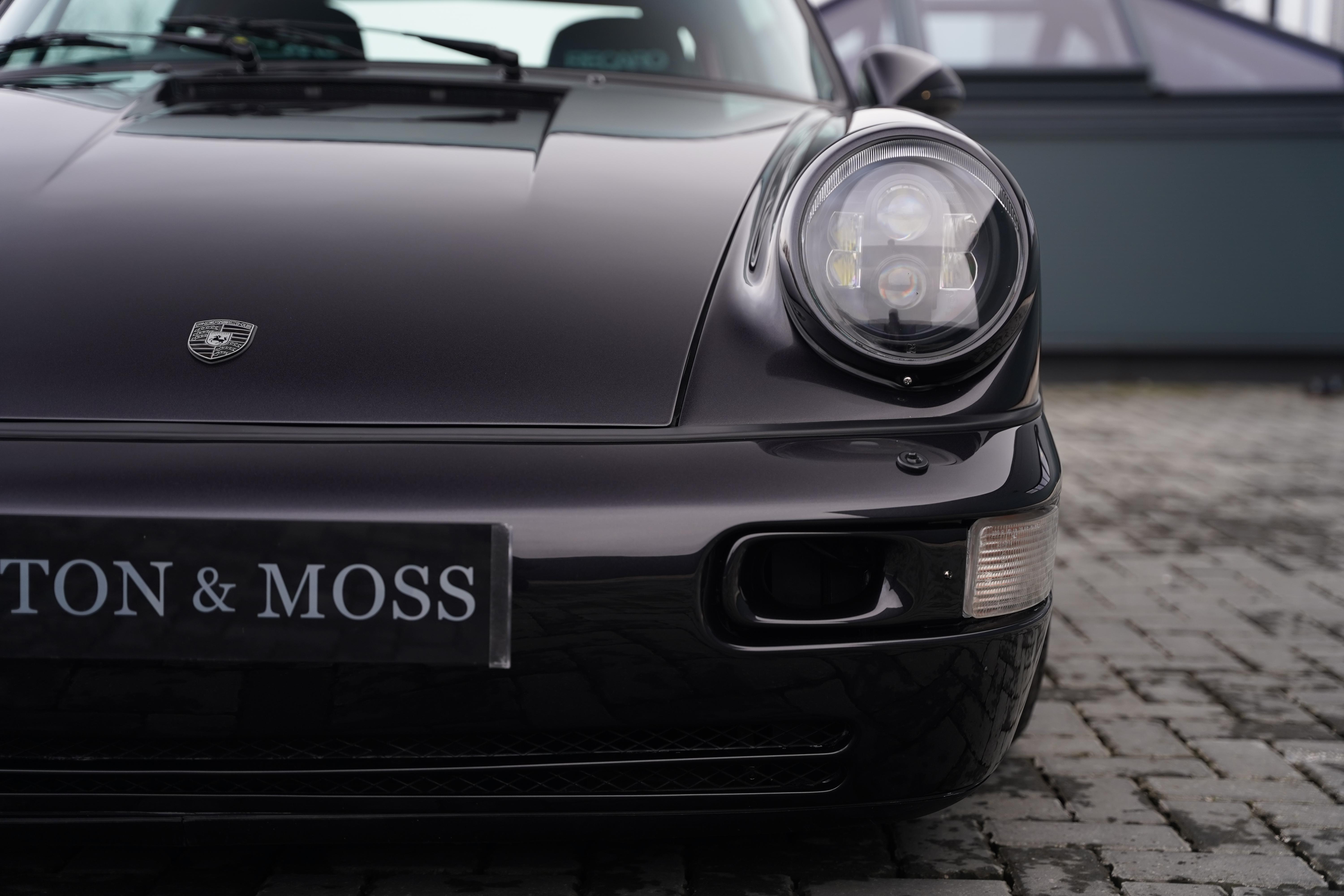 Hilton & Moss are pleased to present this fantastic example, first registered in April 1990. This 964 is fresh from a full external respray by the Hilton & Moss team. Although a fine example already, the previous keeper operated with a ‘no expense spared’ attitude and wanted to ensure this 911 looked better than when it left the factory. The client commissioned a complete ‘panel off’ respray correcting any previous works that had been completed over the last 35 years of the car’s life. Following on from the variety of high end restomods already completed on the vehicle it was decided that the car would be finished in the premium colour of Porsche Basalt Black, a modern colour that carries real depth with an elegant metallic fleck.