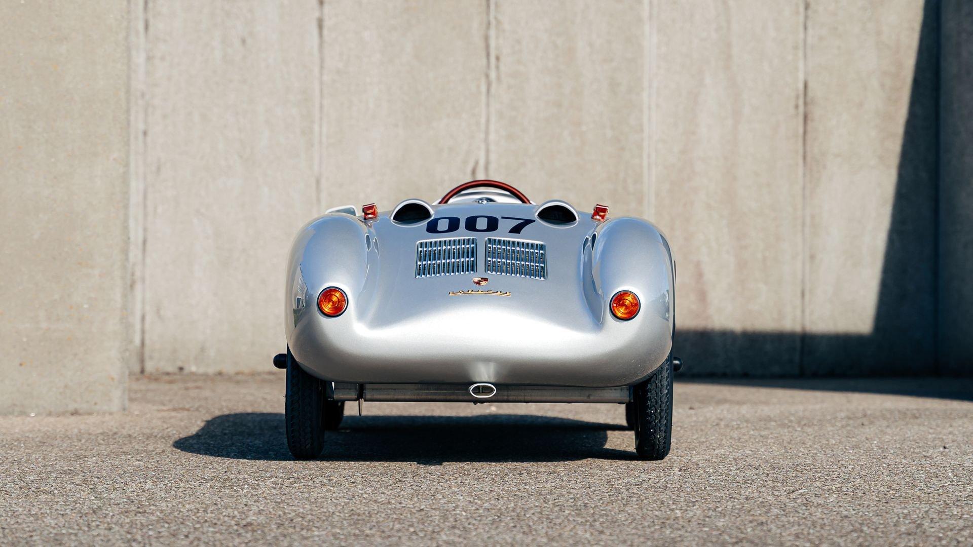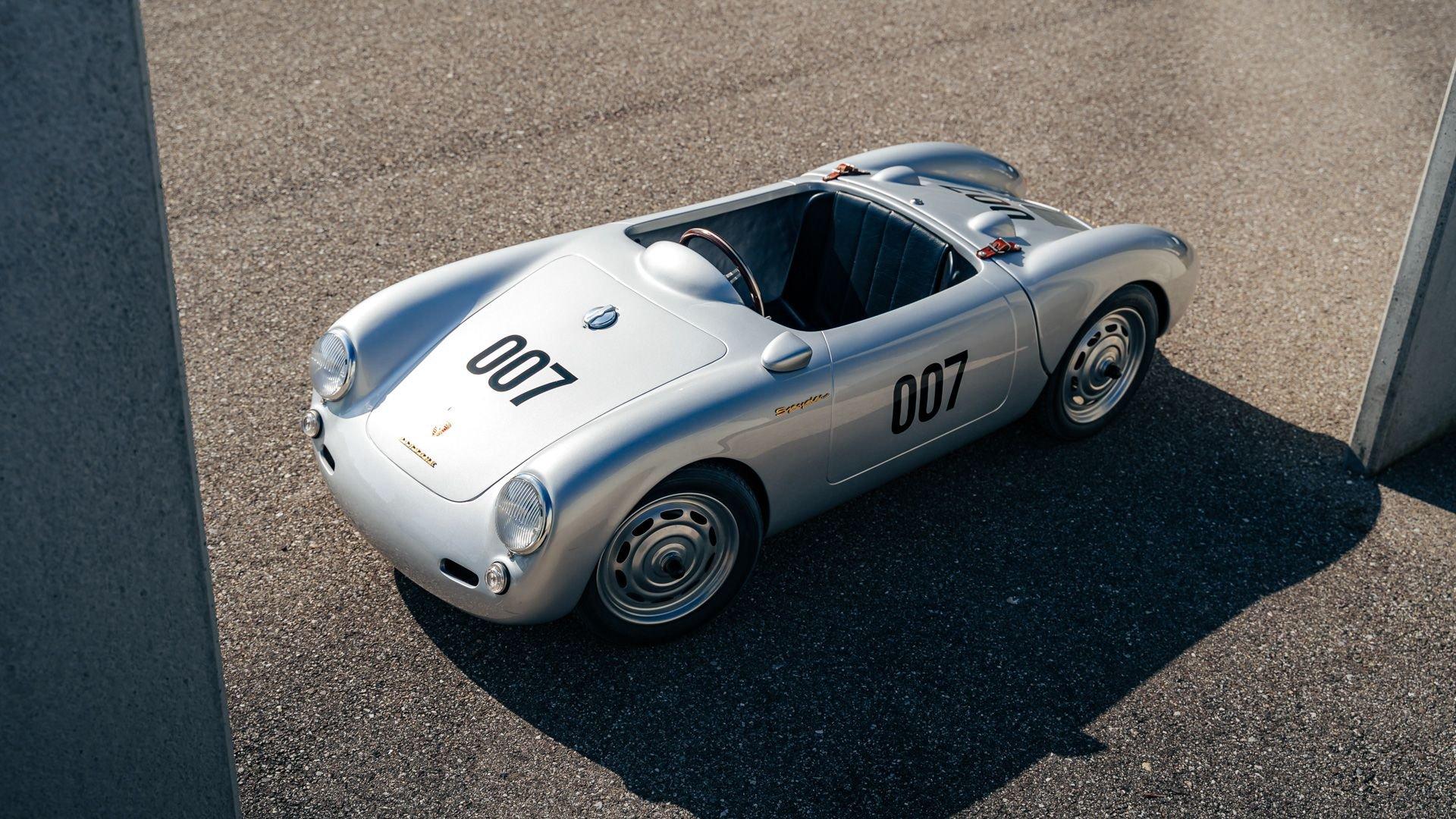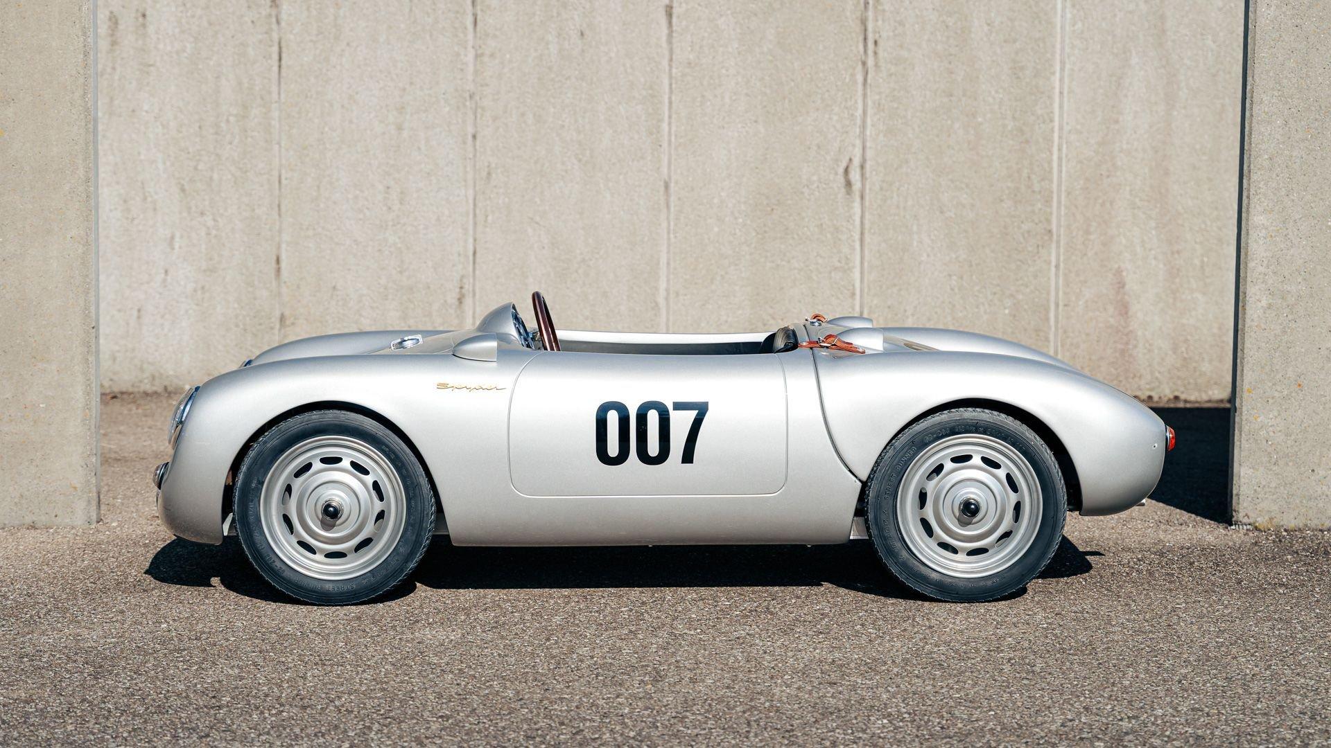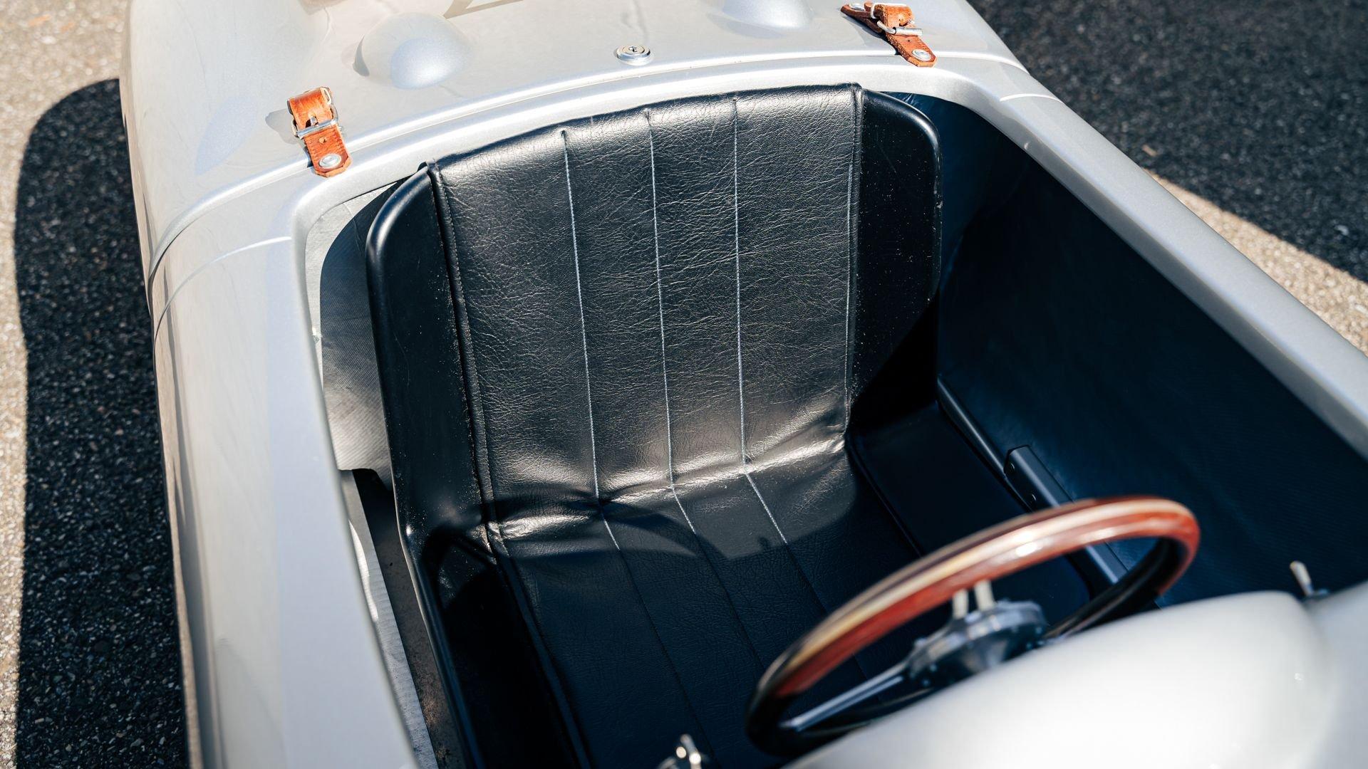 This miniature 550 features a silver-painted hand-laminated fiberglass body paired with a chassis made of aluminum and special steel. Powered by a 24-volt electric drivetrain with two forward speeds and reverse, it is capable of up to 20 kilometers per hour depending on rider size. Chrome-plated hardware, gold 'Spyder' and 'Porsche' badging, and a real wooden three-spoke steering wheel with a color Porsche crest are standard, along with working lights and pneumatic tires for a surprisingly refined driving experience. While originally created for children, the Pennewitz 550 Spyder has won over as many adult collectors as well, with many purchasing them as bespoke companions to their full-scale Porsche. This example is equipped with 007 race numbers and a black upholstered seat.