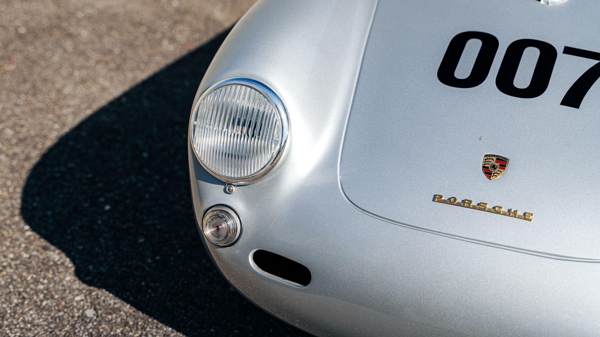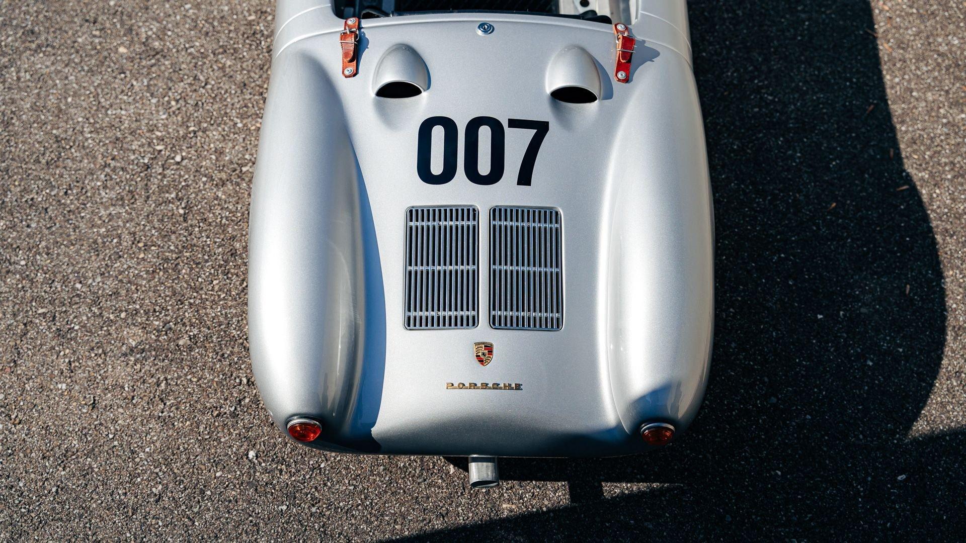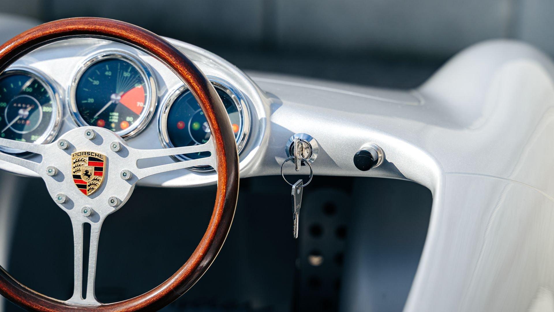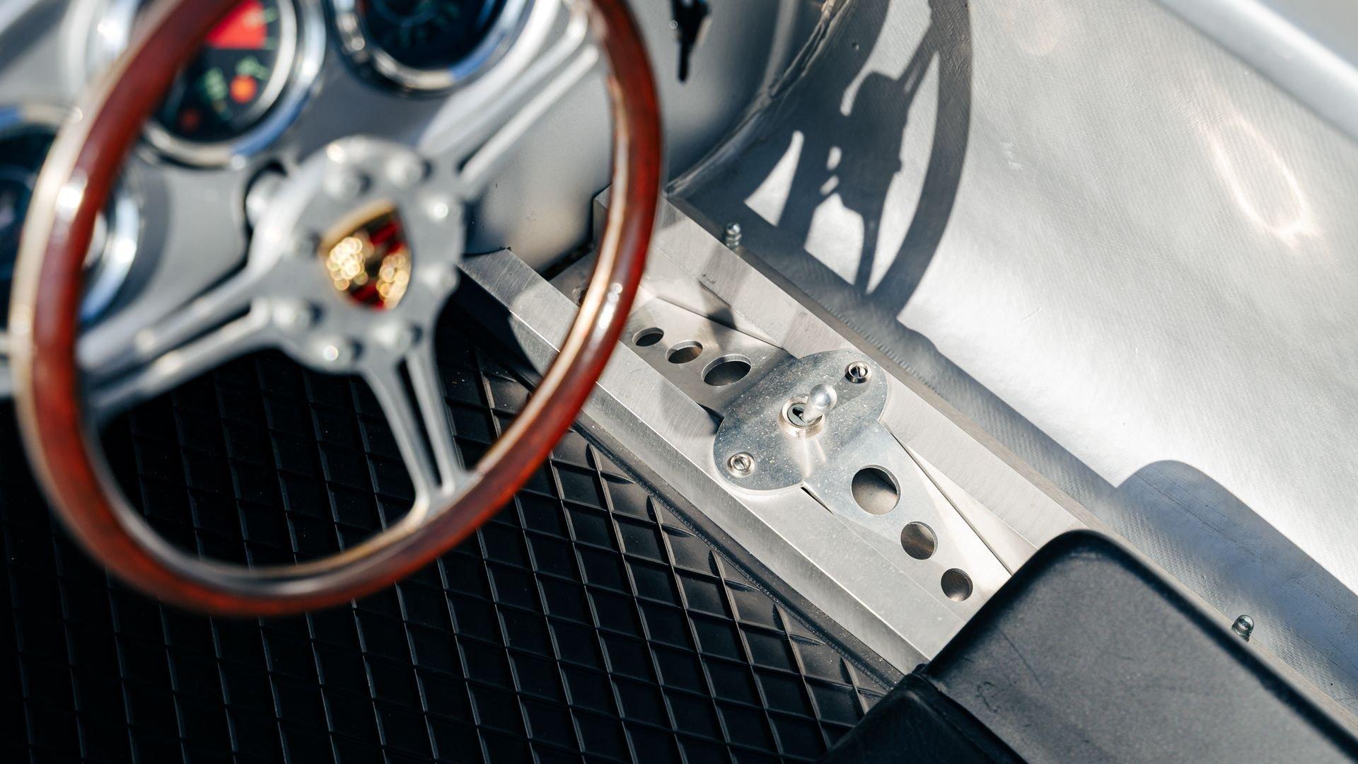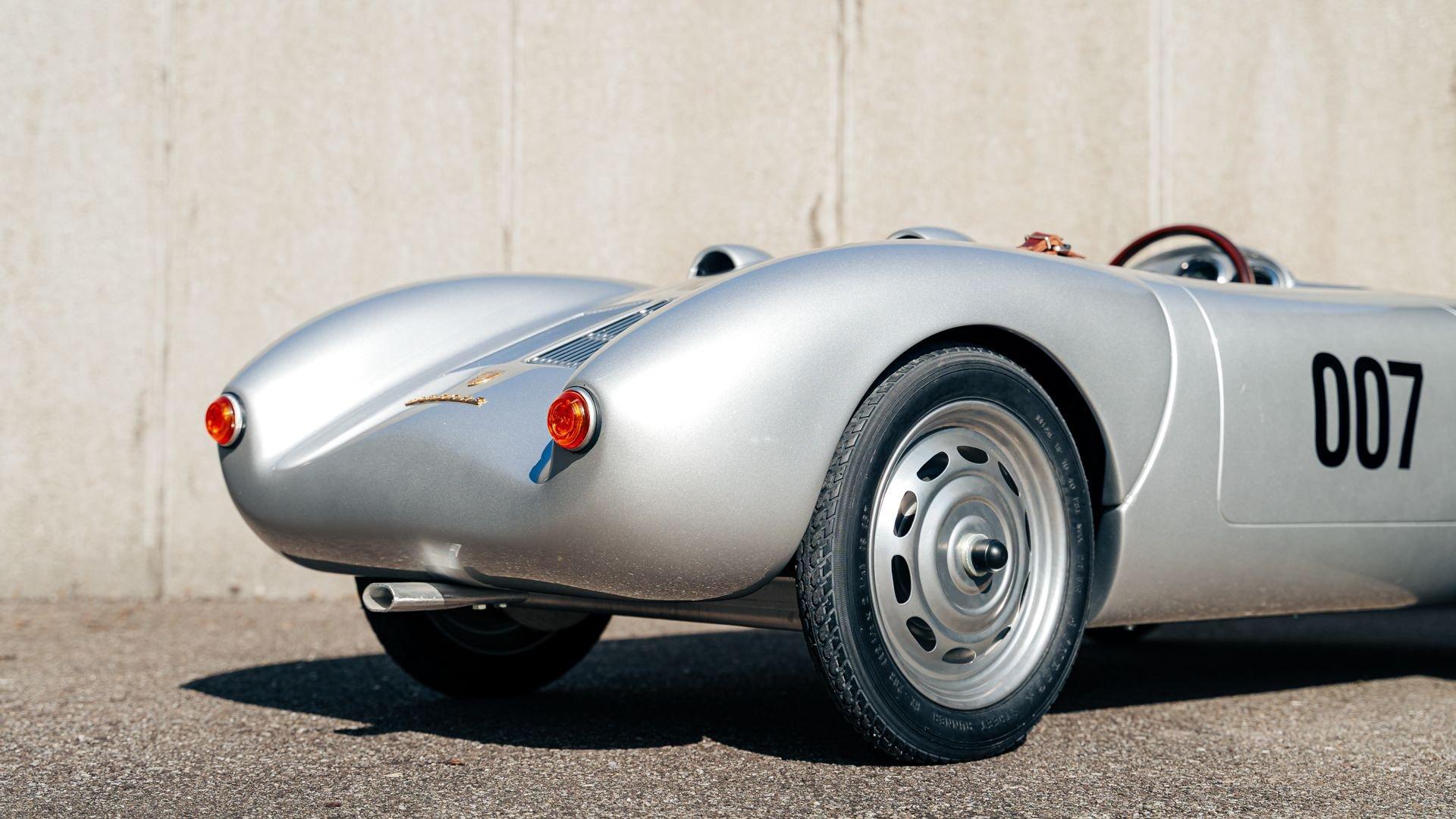 This miniature 550 features a silver-painted hand-laminated fiberglass body paired with a chassis made of aluminum and special steel. Powered by a 24-volt electric drivetrain with two forward speeds and reverse, it is capable of up to 20 kilometers per hour depending on rider size. Chrome-plated hardware, gold 'Spyder' and 'Porsche' badging, and a real wooden three-spoke steering wheel with a color Porsche crest are standard, along with working lights and pneumatic tires for a surprisingly refined driving experience. While originally created for children, the Pennewitz 550 Spyder has won over as many adult collectors as well, with many purchasing them as bespoke companions to their full-scale Porsche. This example is equipped with 007 race numbers and a black upholstered seat.