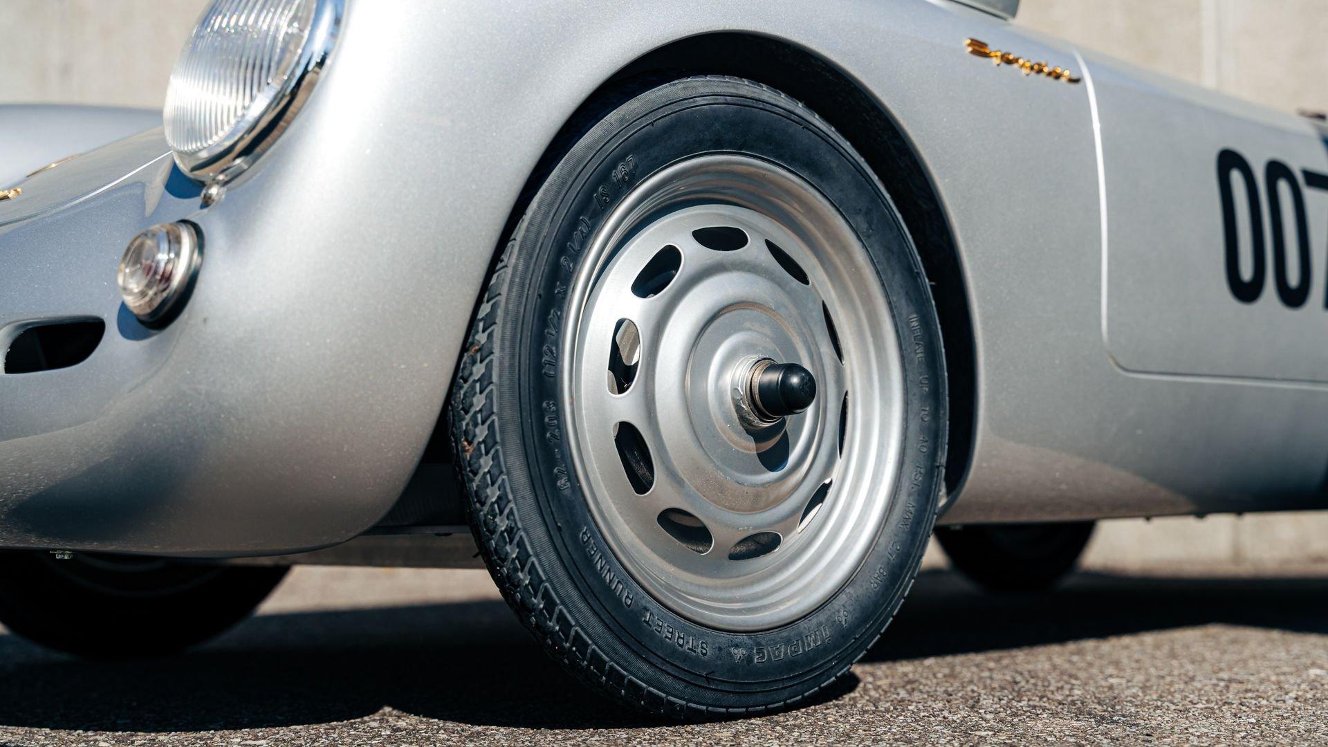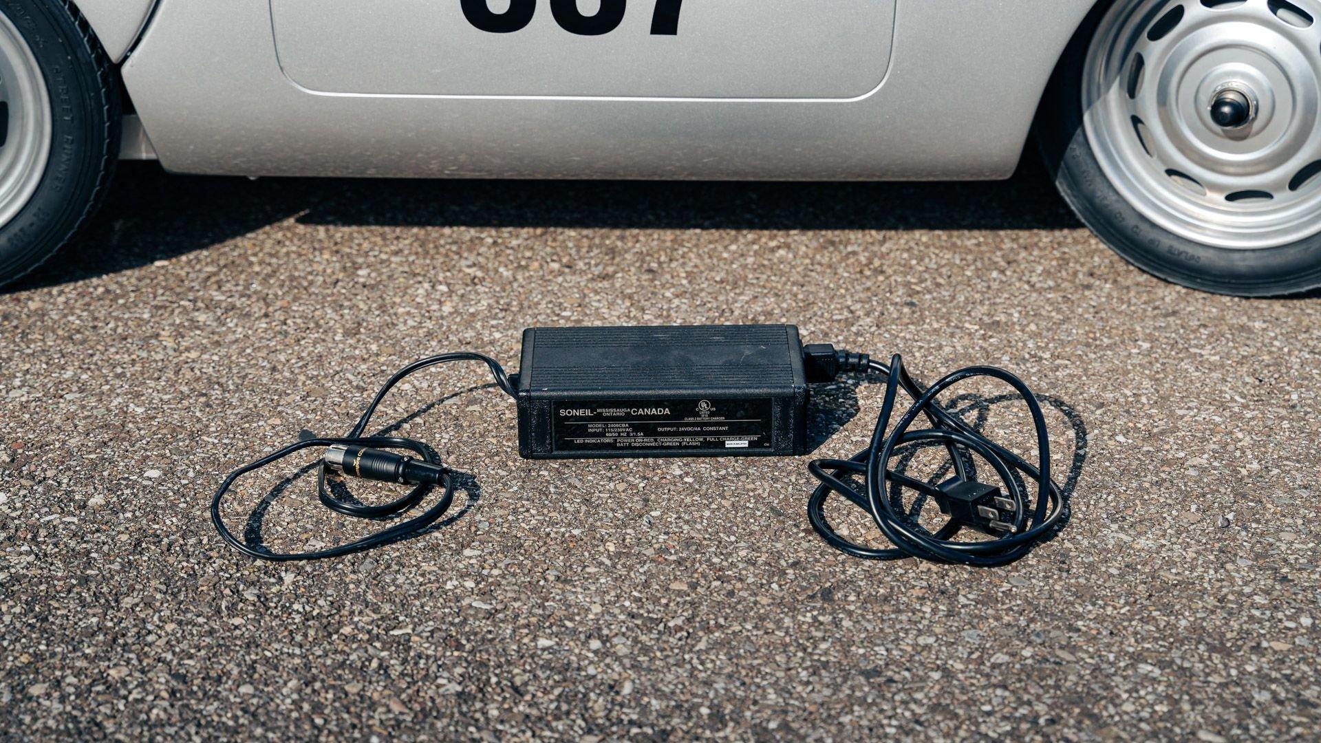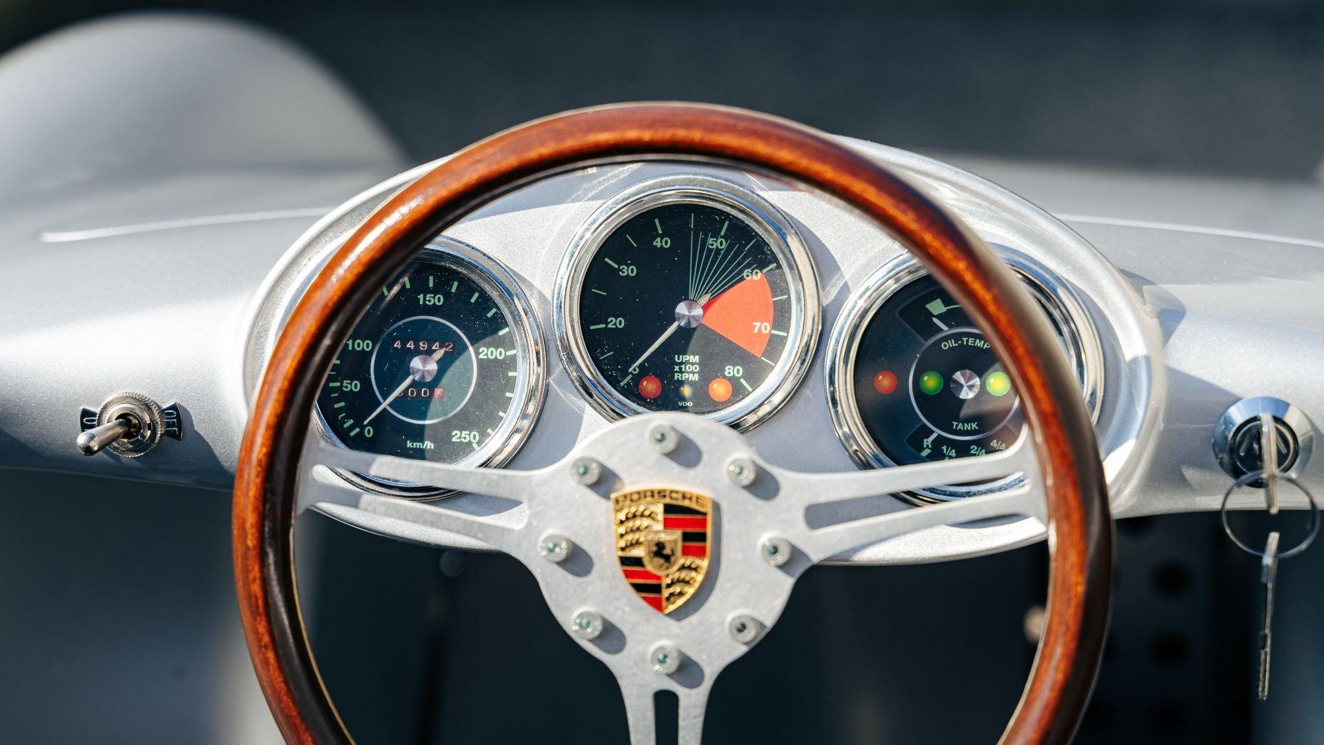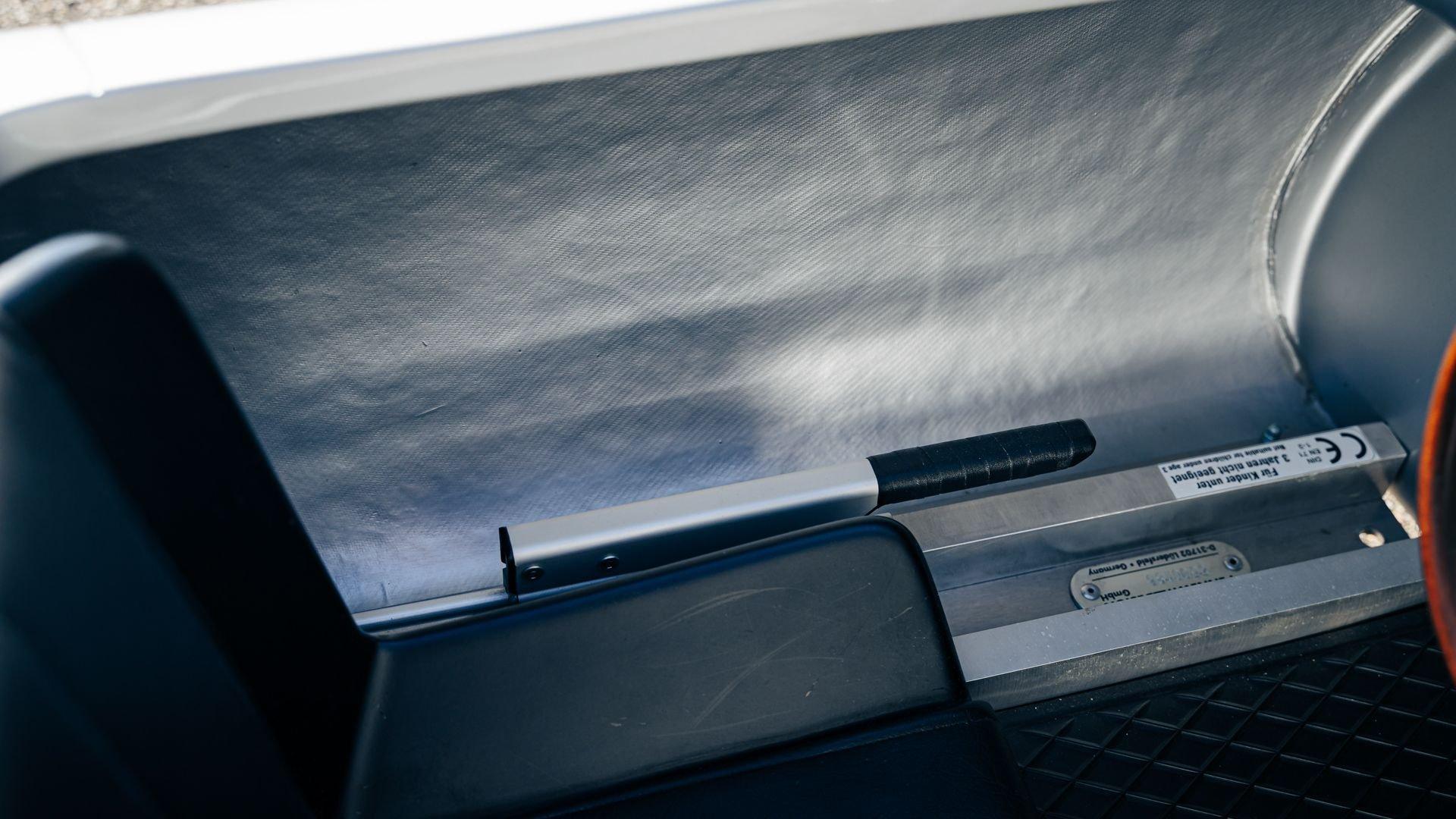 This miniature 550 features a silver-painted hand-laminated fiberglass body paired with a chassis made of aluminum and special steel. Powered by a 24-volt electric drivetrain with two forward speeds and reverse, it is capable of up to 20 kilometers per hour depending on rider size. Chrome-plated hardware, gold 'Spyder' and 'Porsche' badging, and a real wooden three-spoke steering wheel with a color Porsche crest are standard, along with working lights and pneumatic tires for a surprisingly refined driving experience. While originally created for children, the Pennewitz 550 Spyder has won over as many adult collectors as well, with many purchasing them as bespoke companions to their full-scale Porsche. This example is equipped with 007 race numbers and a black upholstered seat.