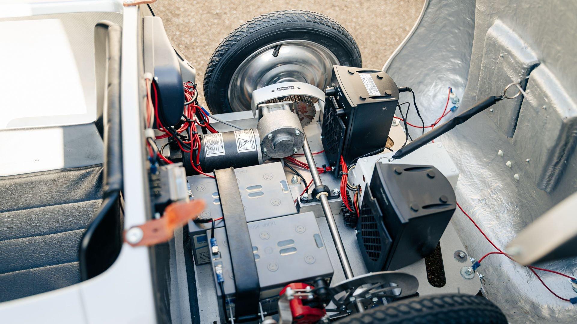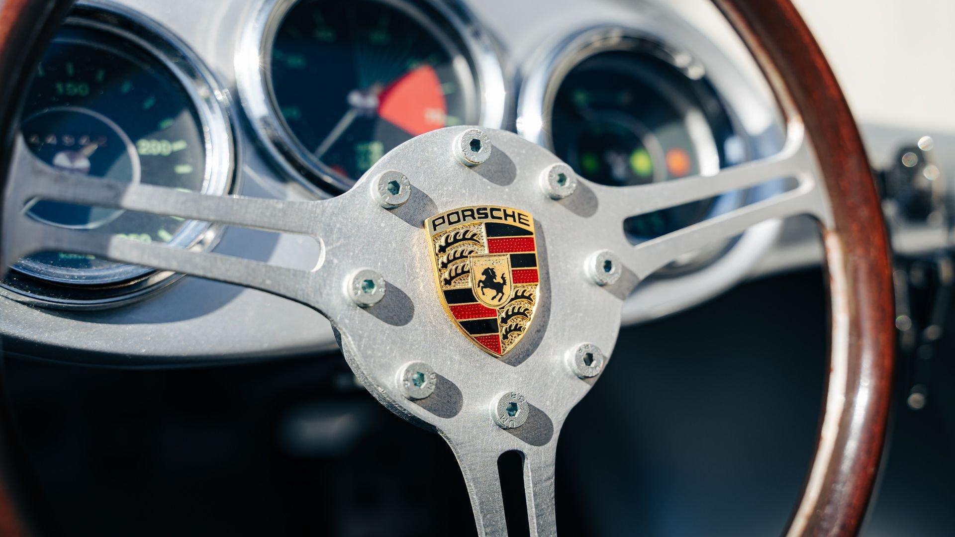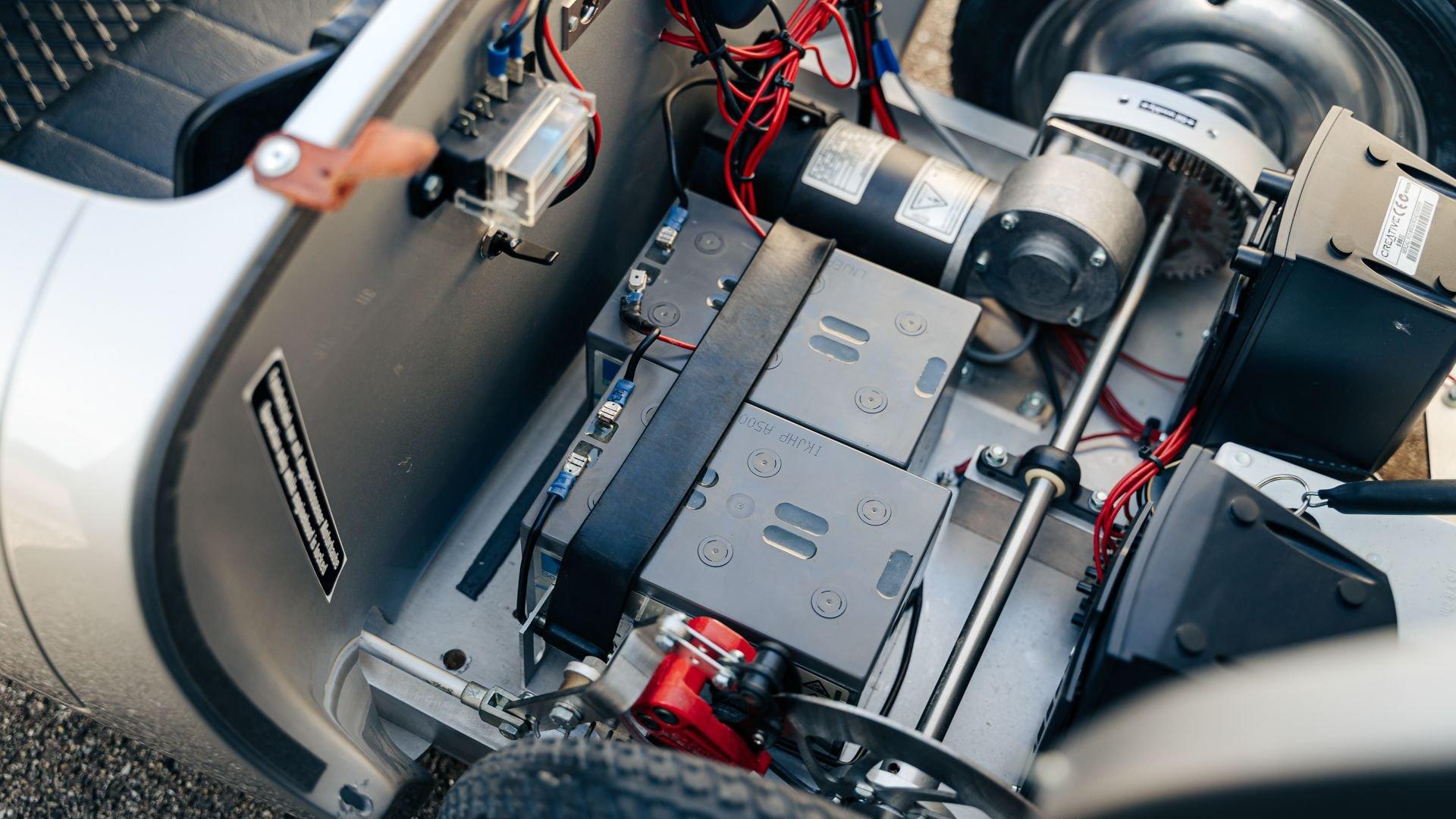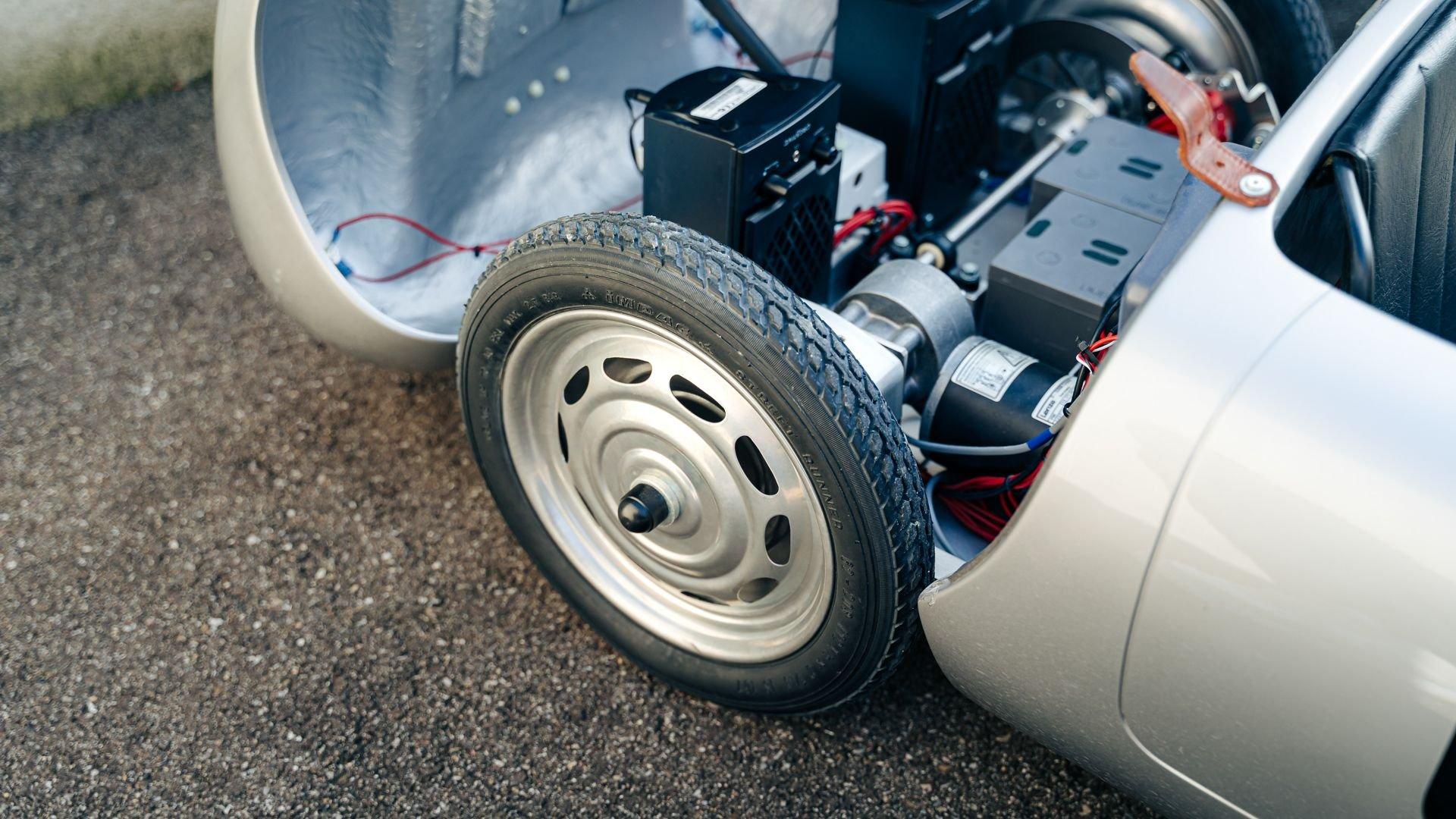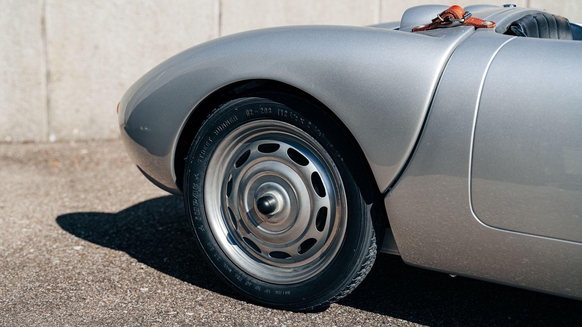 This miniature 550 features a silver-painted hand-laminated fiberglass body paired with a chassis made of aluminum and special steel. Powered by a 24-volt electric drivetrain with two forward speeds and reverse, it is capable of up to 20 kilometers per hour depending on rider size. Chrome-plated hardware, gold 'Spyder' and 'Porsche' badging, and a real wooden three-spoke steering wheel with a color Porsche crest are standard, along with working lights and pneumatic tires for a surprisingly refined driving experience. While originally created for children, the Pennewitz 550 Spyder has won over as many adult collectors as well, with many purchasing them as bespoke companions to their full-scale Porsche. This example is equipped with 007 race numbers and a black upholstered seat.