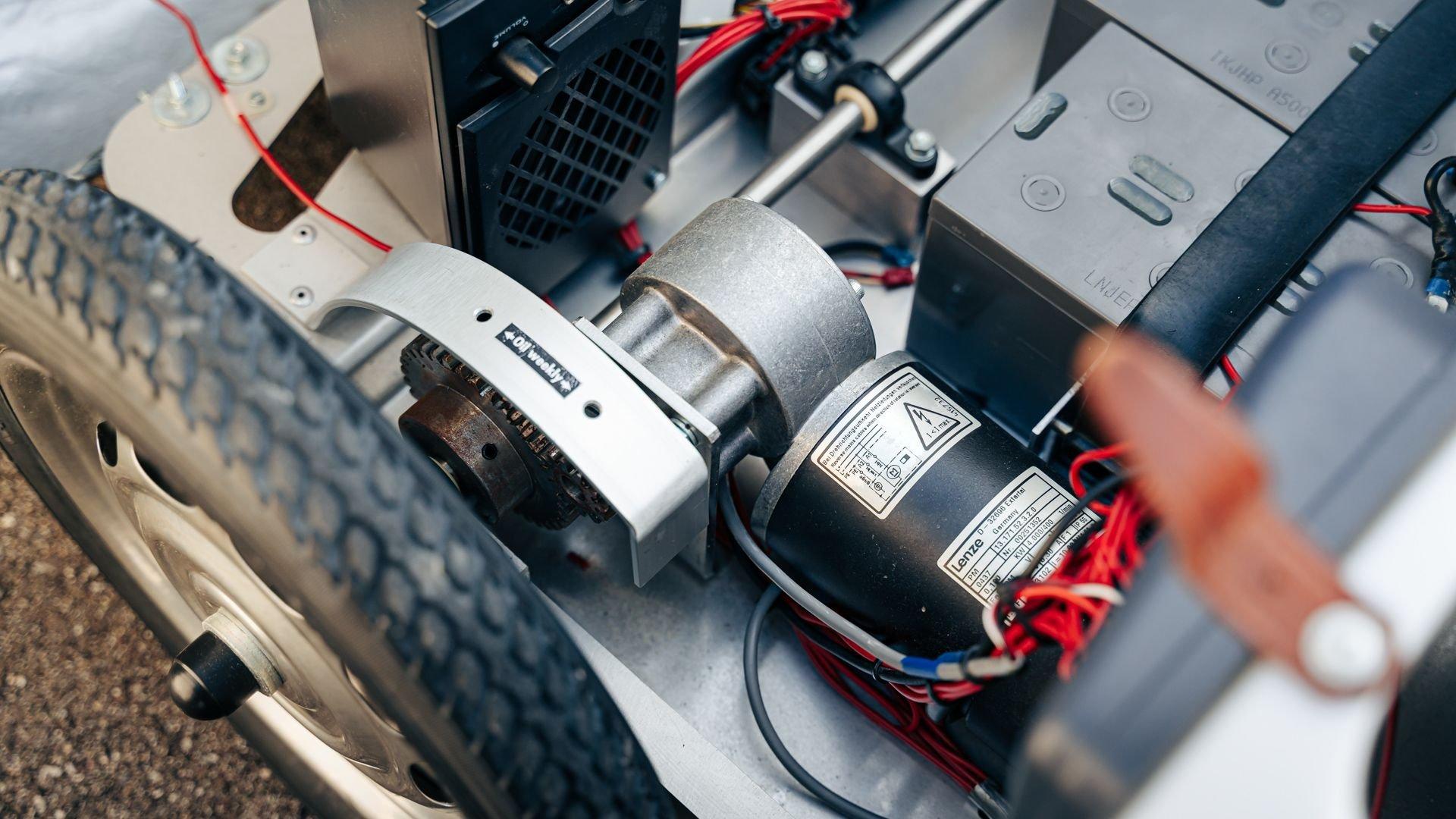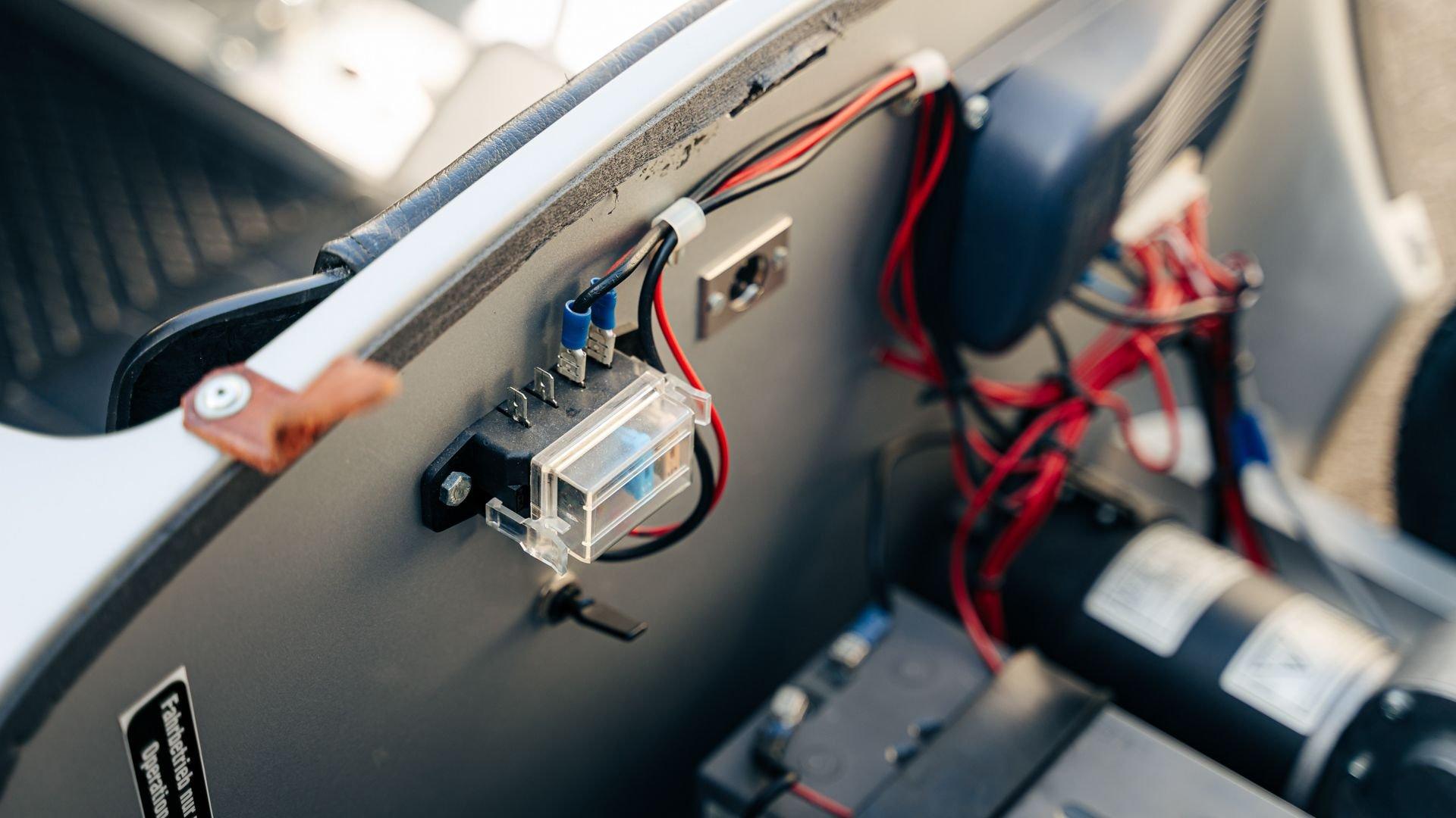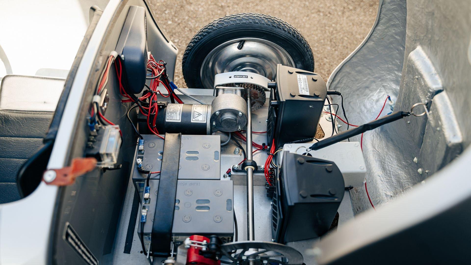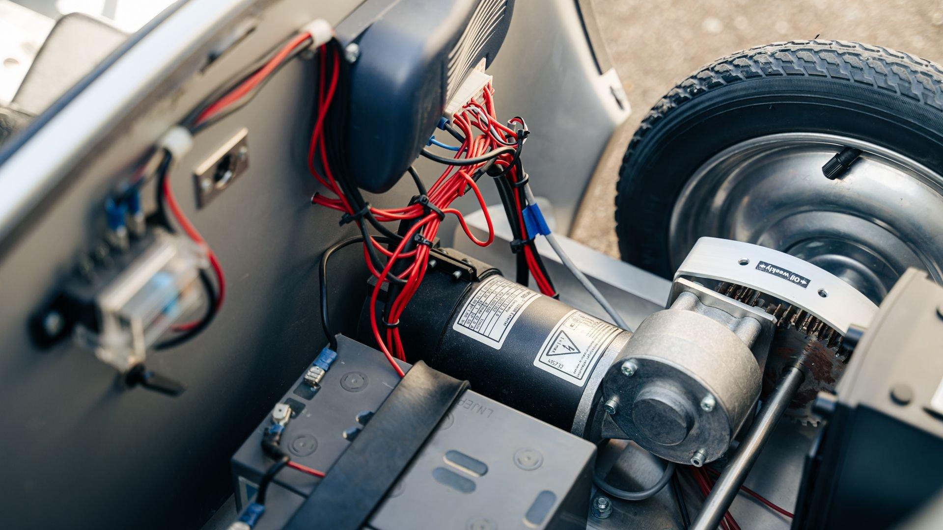 This miniature 550 features a silver-painted hand-laminated fiberglass body paired with a chassis made of aluminum and special steel. Powered by a 24-volt electric drivetrain with two forward speeds and reverse, it is capable of up to 20 kilometers per hour depending on rider size. Chrome-plated hardware, gold 'Spyder' and 'Porsche' badging, and a real wooden three-spoke steering wheel with a color Porsche crest are standard, along with working lights and pneumatic tires for a surprisingly refined driving experience. While originally created for children, the Pennewitz 550 Spyder has won over as many adult collectors as well, with many purchasing them as bespoke companions to their full-scale Porsche. This example is equipped with 007 race numbers and a black upholstered seat.