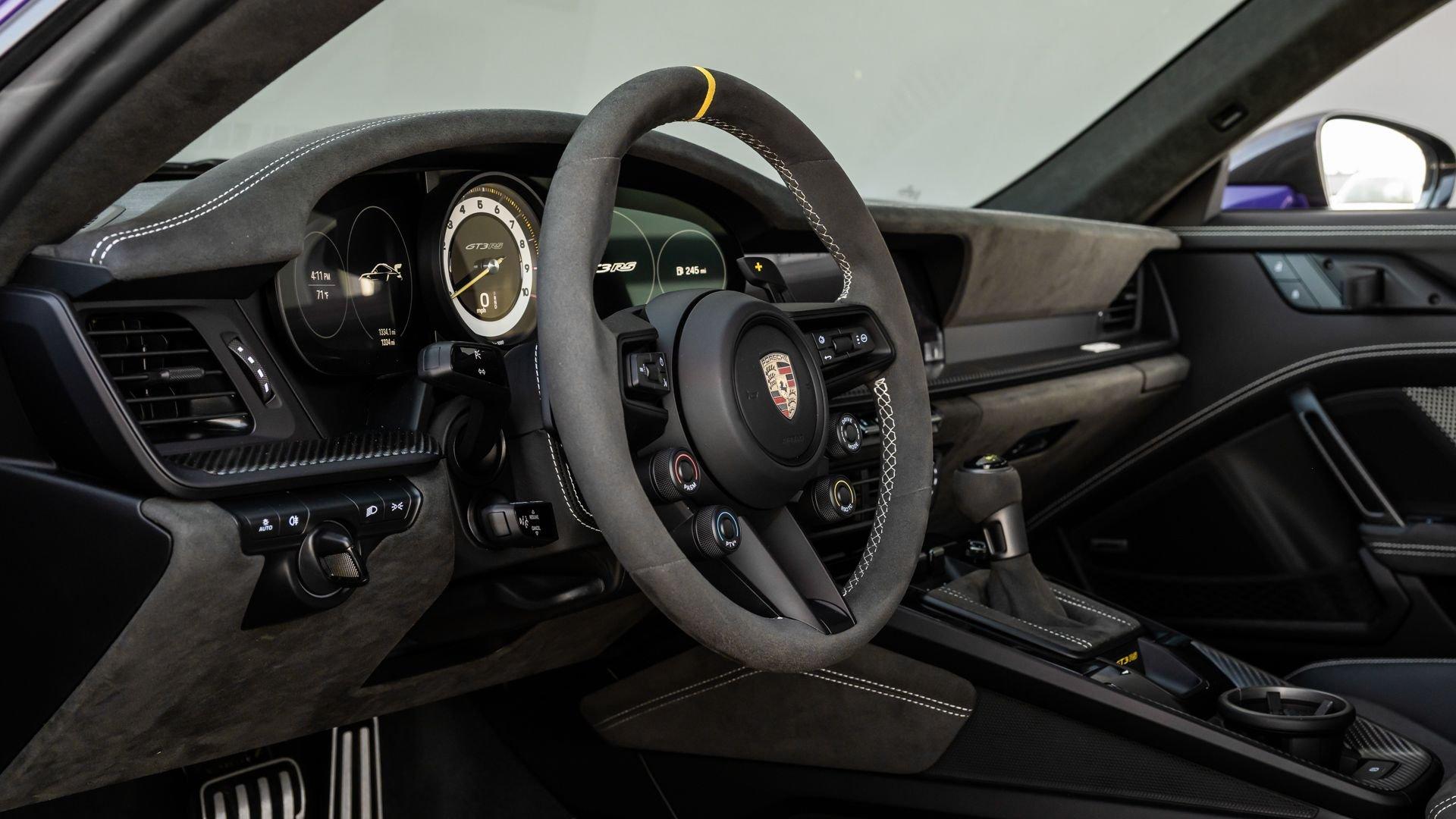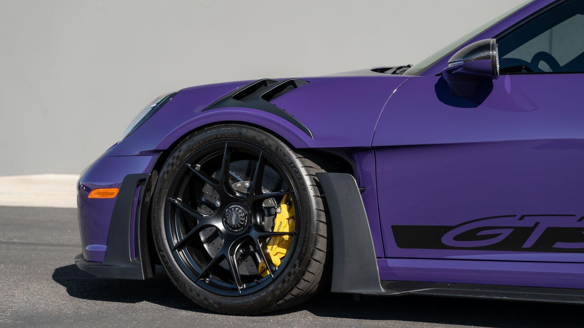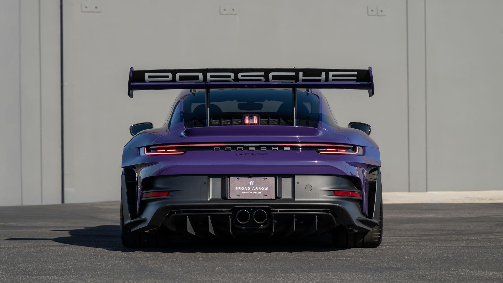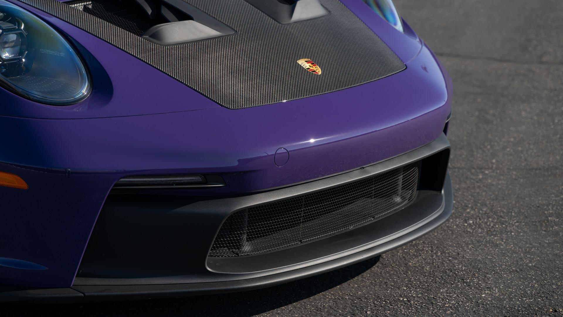 Finished in Paint to Sample Ultraviolet-a deep, saturated violet applied at a cost of $21,720-over a Black Leather/Race-Tex interior with GT Silver stitching, the car carries a number of desirable extras. The aggressive exterior package is completed by Porsche Ceramic Composite Brakes (PCCB) with Yellow calipers, Satin Black-finished forged magnesium wheels, LED-Matrix headlights in Black with PDLS+, and Exclusive Design taillights. Inside, the driver is faced with a White central tachometer and Chrono stopwatch dial, while details such as the Pebble Grey deviated stitching, illuminated matte carbon-fiber door-sill guards, Race-Tex sun visors, and aluminum pedals and footrest complement the car's thoughtful interior specification. A front axle lift system and a BOSE Surround Sound System add a welcome measure of refinement to this highly focused machine.