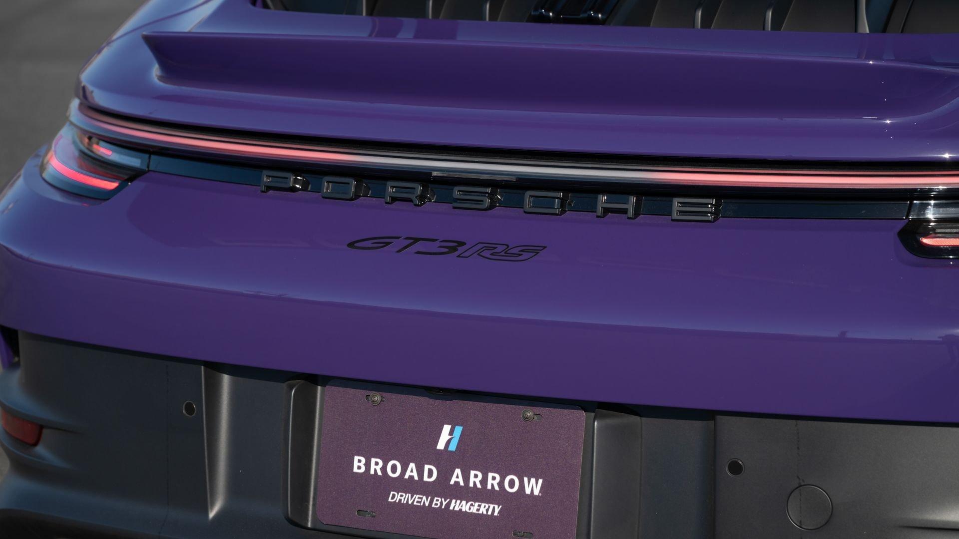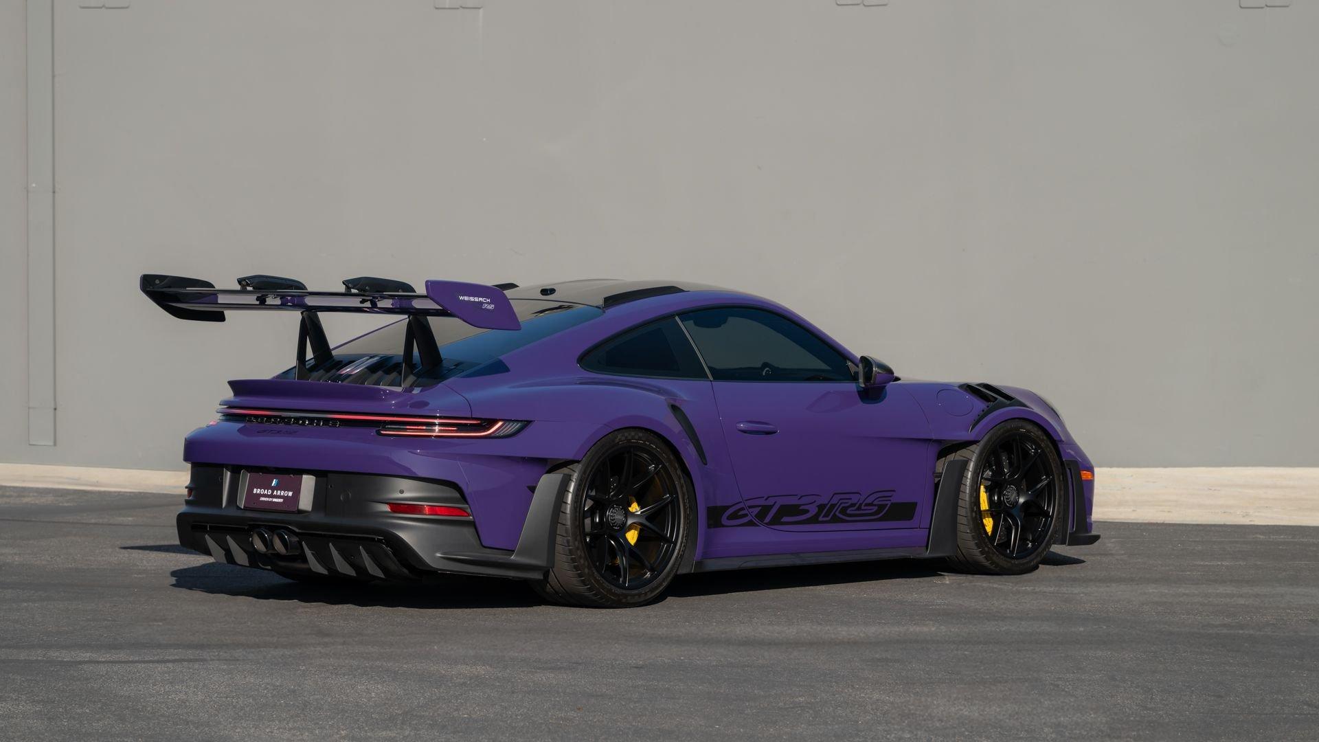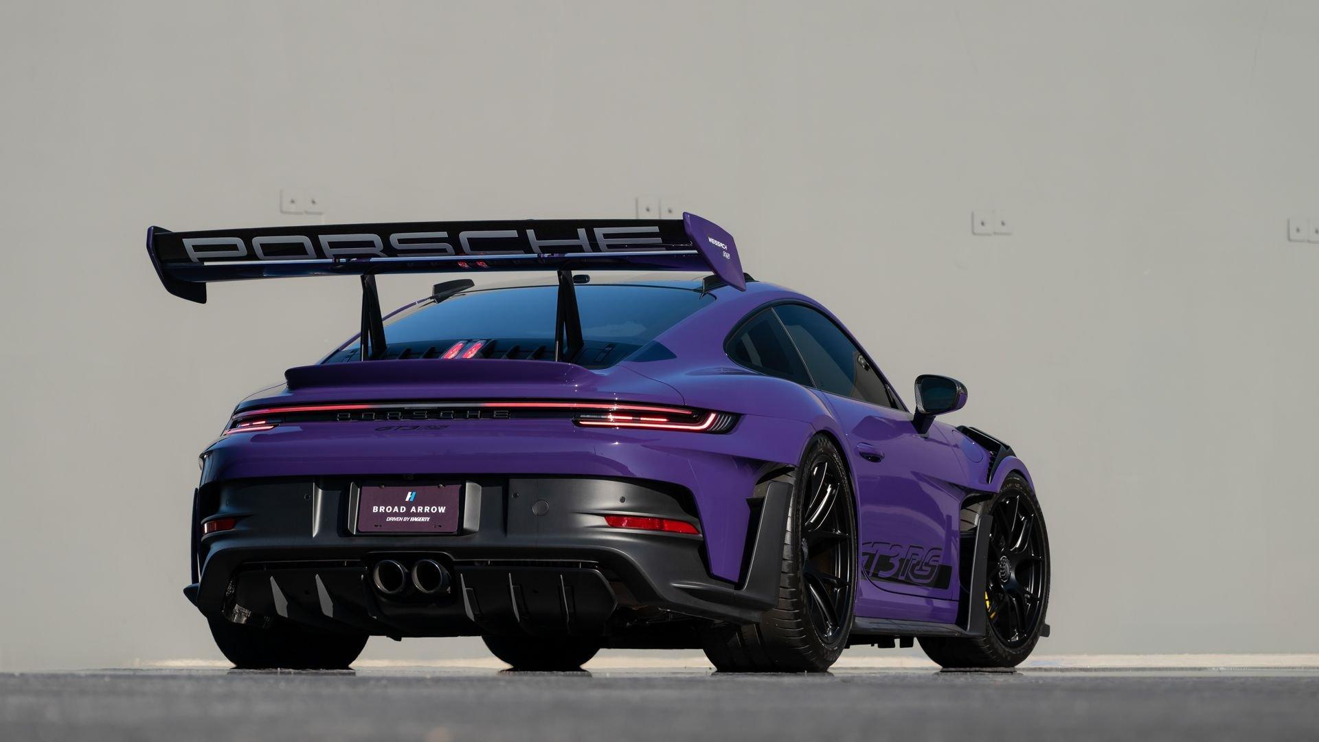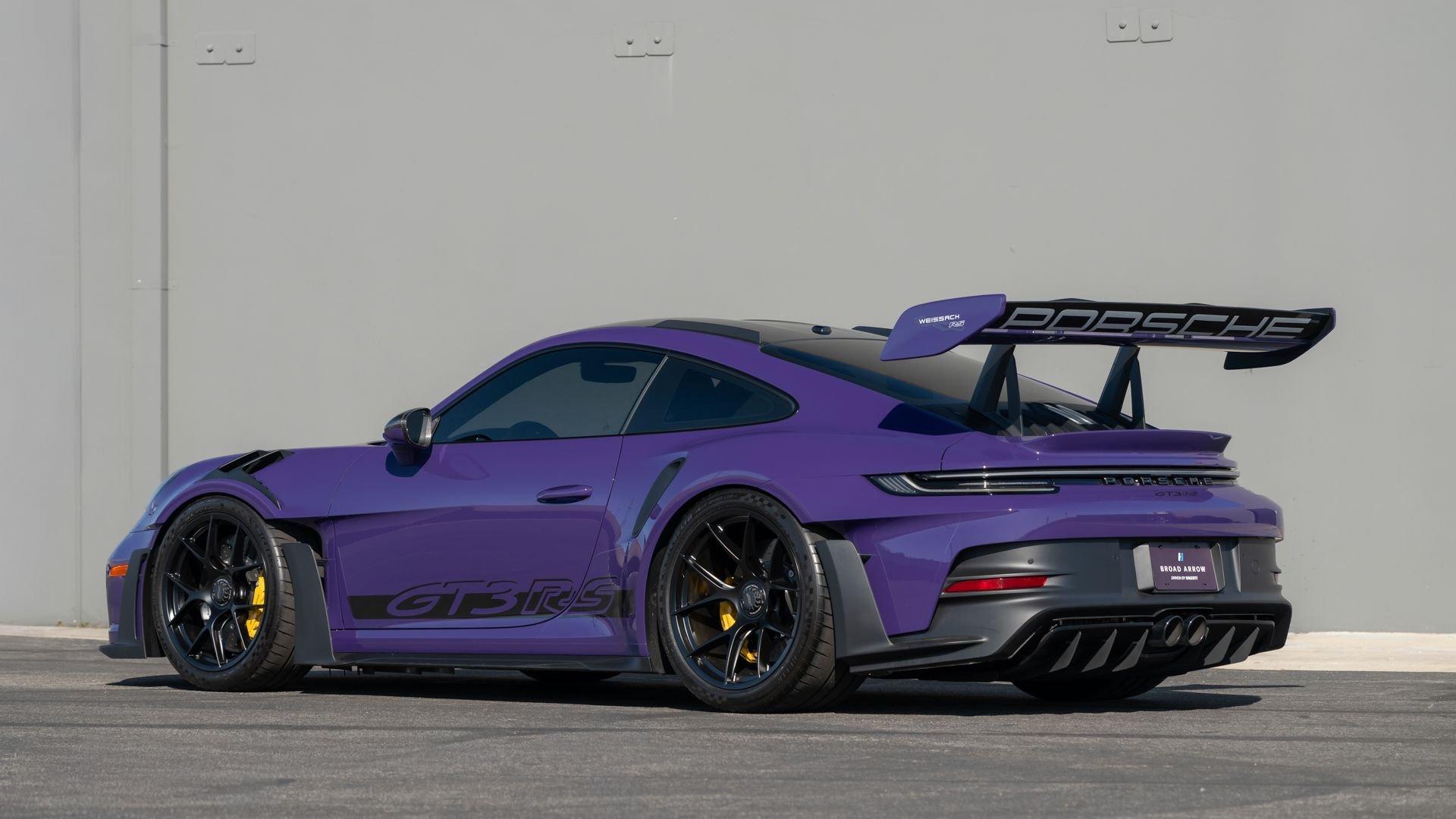 Finished in Paint to Sample Ultraviolet-a deep, saturated violet applied at a cost of $21,720-over a Black Leather/Race-Tex interior with GT Silver stitching, the car carries a number of desirable extras. The aggressive exterior package is completed by Porsche Ceramic Composite Brakes (PCCB) with Yellow calipers, Satin Black-finished forged magnesium wheels, LED-Matrix headlights in Black with PDLS+, and Exclusive Design taillights. Inside, the driver is faced with a White central tachometer and Chrono stopwatch dial, while details such as the Pebble Grey deviated stitching, illuminated matte carbon-fiber door-sill guards, Race-Tex sun visors, and aluminum pedals and footrest complement the car's thoughtful interior specification. A front axle lift system and a BOSE Surround Sound System add a welcome measure of refinement to this highly focused machine.