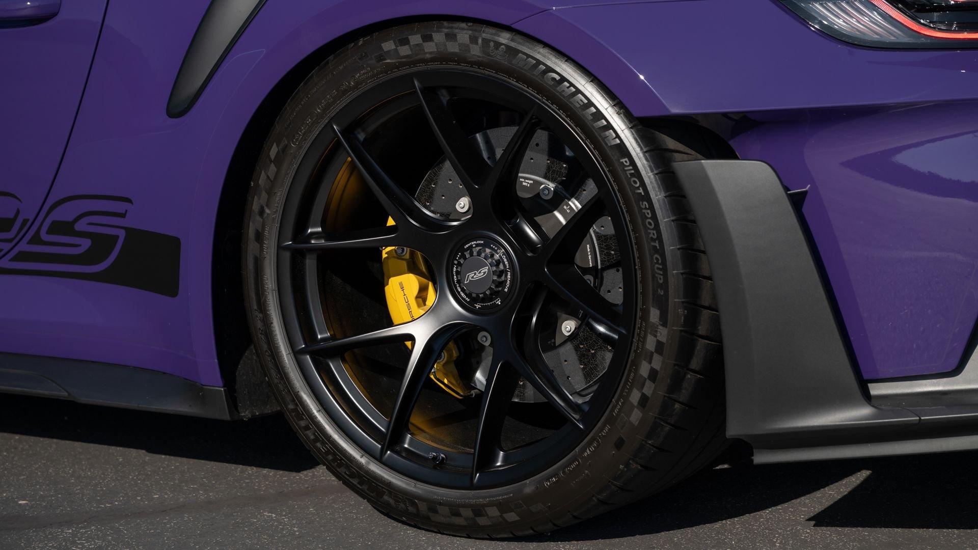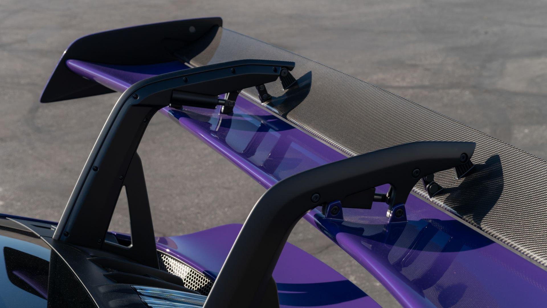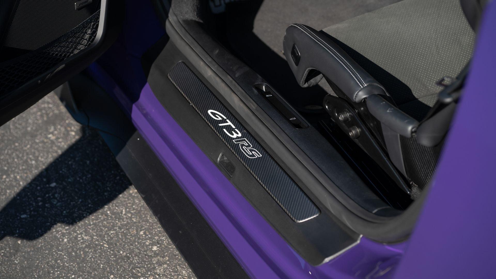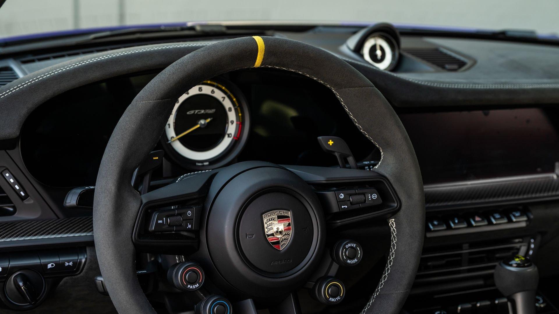 Finished in Paint to Sample Ultraviolet-a deep, saturated violet applied at a cost of $21,720-over a Black Leather/Race-Tex interior with GT Silver stitching, the car carries a number of desirable extras. The aggressive exterior package is completed by Porsche Ceramic Composite Brakes (PCCB) with Yellow calipers, Satin Black-finished forged magnesium wheels, LED-Matrix headlights in Black with PDLS+, and Exclusive Design taillights. Inside, the driver is faced with a White central tachometer and Chrono stopwatch dial, while details such as the Pebble Grey deviated stitching, illuminated matte carbon-fiber door-sill guards, Race-Tex sun visors, and aluminum pedals and footrest complement the car's thoughtful interior specification. A front axle lift system and a BOSE Surround Sound System add a welcome measure of refinement to this highly focused machine.