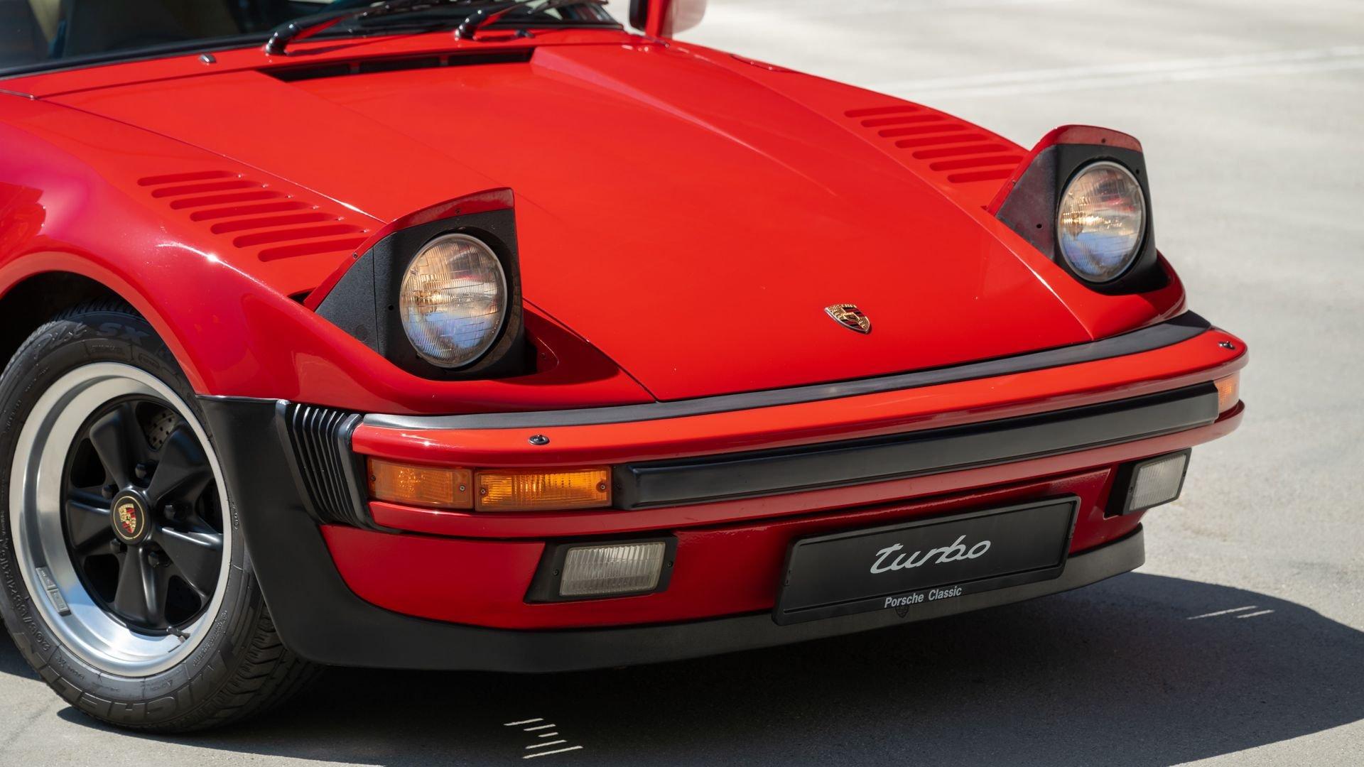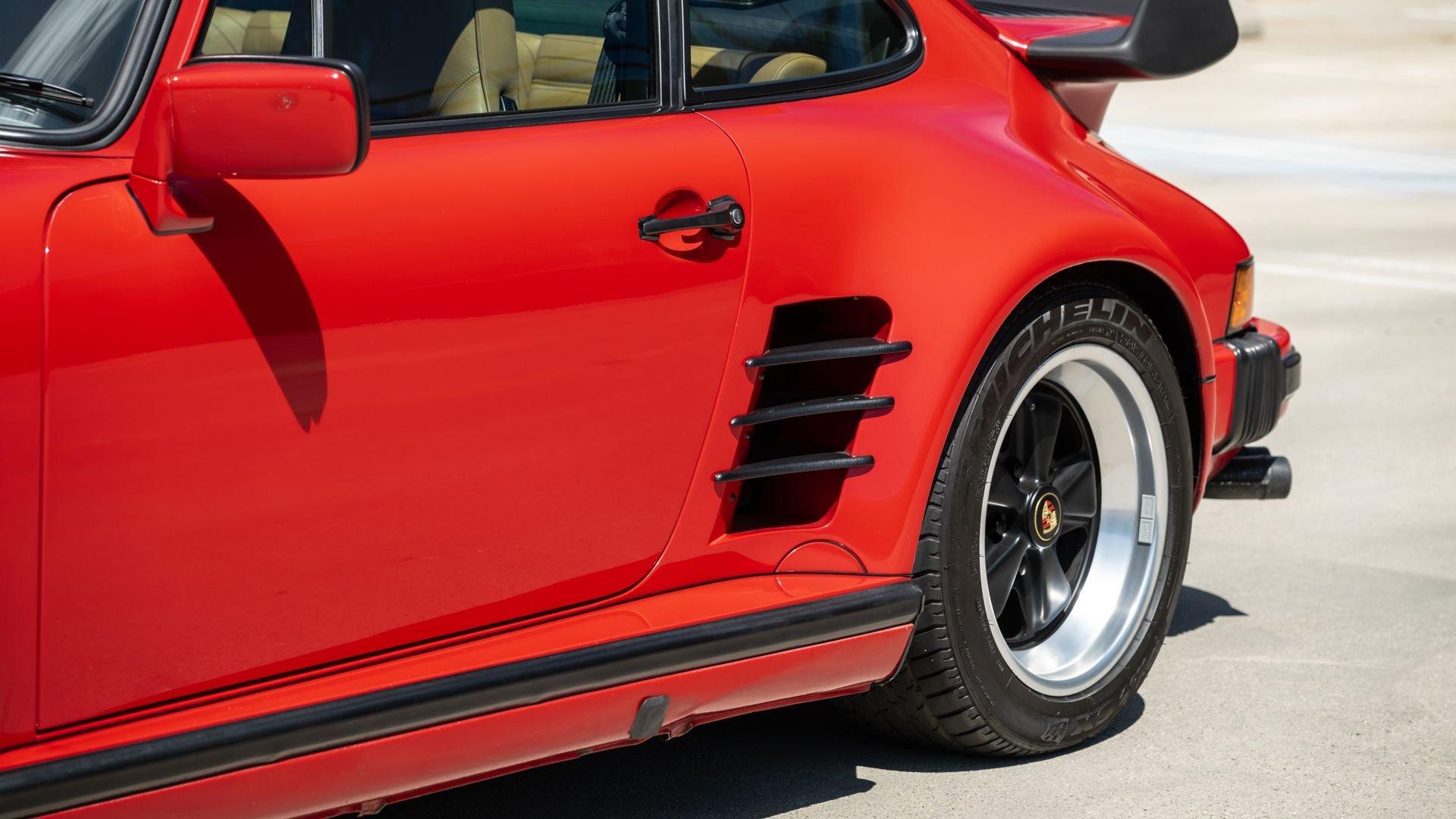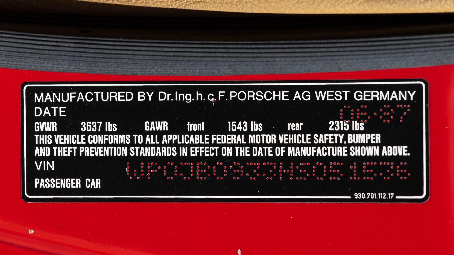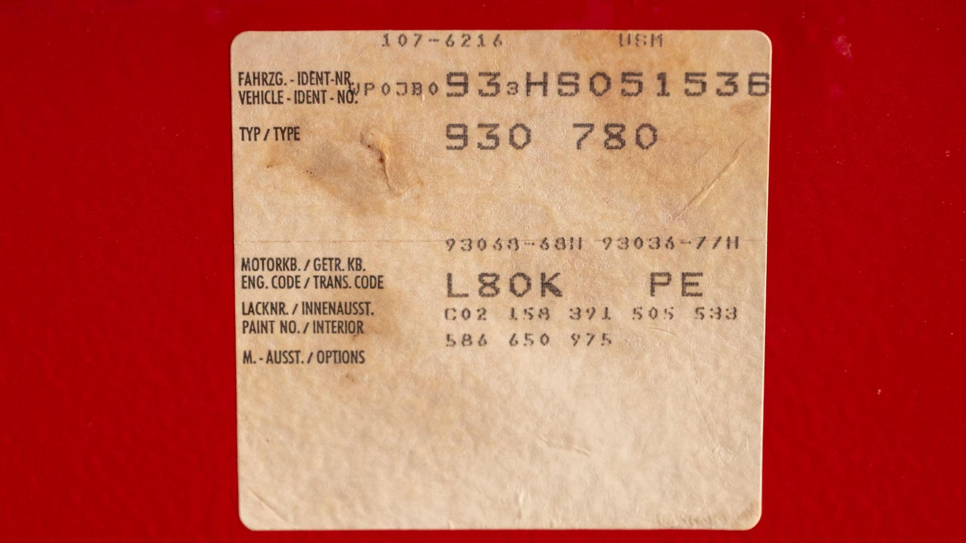 Completed on 15 June 1987 and delivered new through Jim Ellis Porsche of Atlanta, chassis number 51536 was specified in classic Guards Red over Champagne leather and ordered with the coveted M505 Slantnose package, giving the 930 Turbo its dramatic 935-inspired front end, boxed rocker panels, and rear fender intakes. A copy of the original window sticker notes a new price of $86,907 and documents factory options including an electric sunroof, driver lumbar support, Blaupunkt Reno radio, stone guard decals, and a velour-trimmed luggage compartment. One of just 144 U.S.-market Slantnose Turbo Coupes produced for the model year, it retains its matching-numbers 3.3-liter flat-six and four-speed manual transaxle, with correspondence from Porsche Cars North America recording that serial numbers 68H01602 and 77H02366 are original to the car.