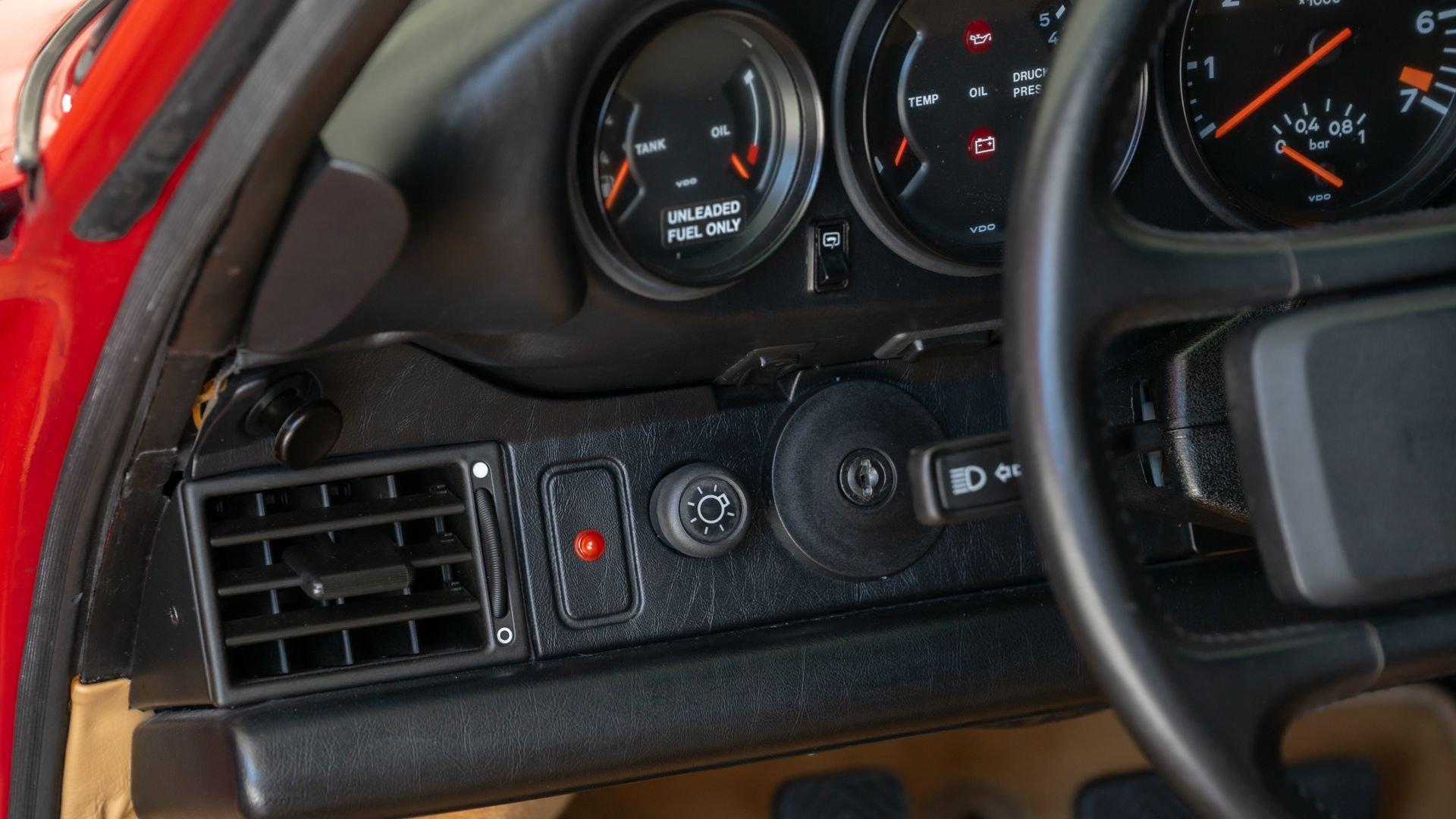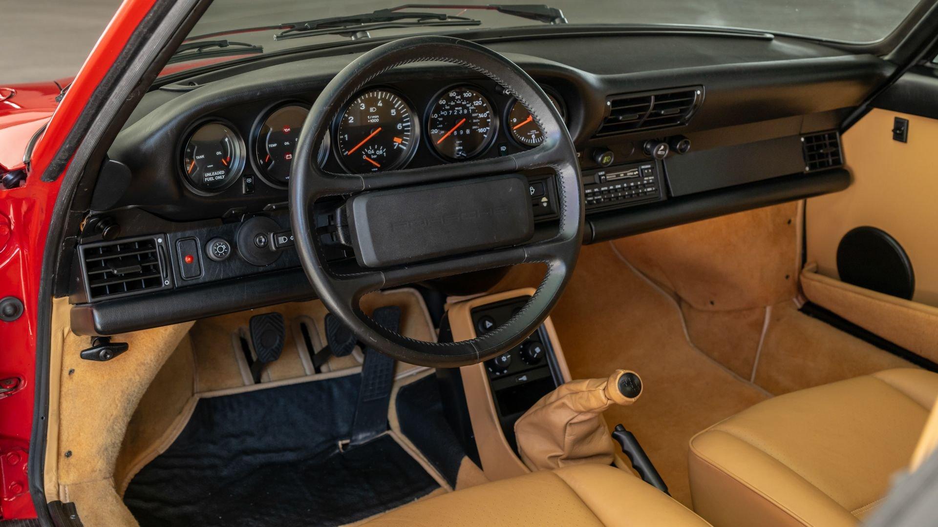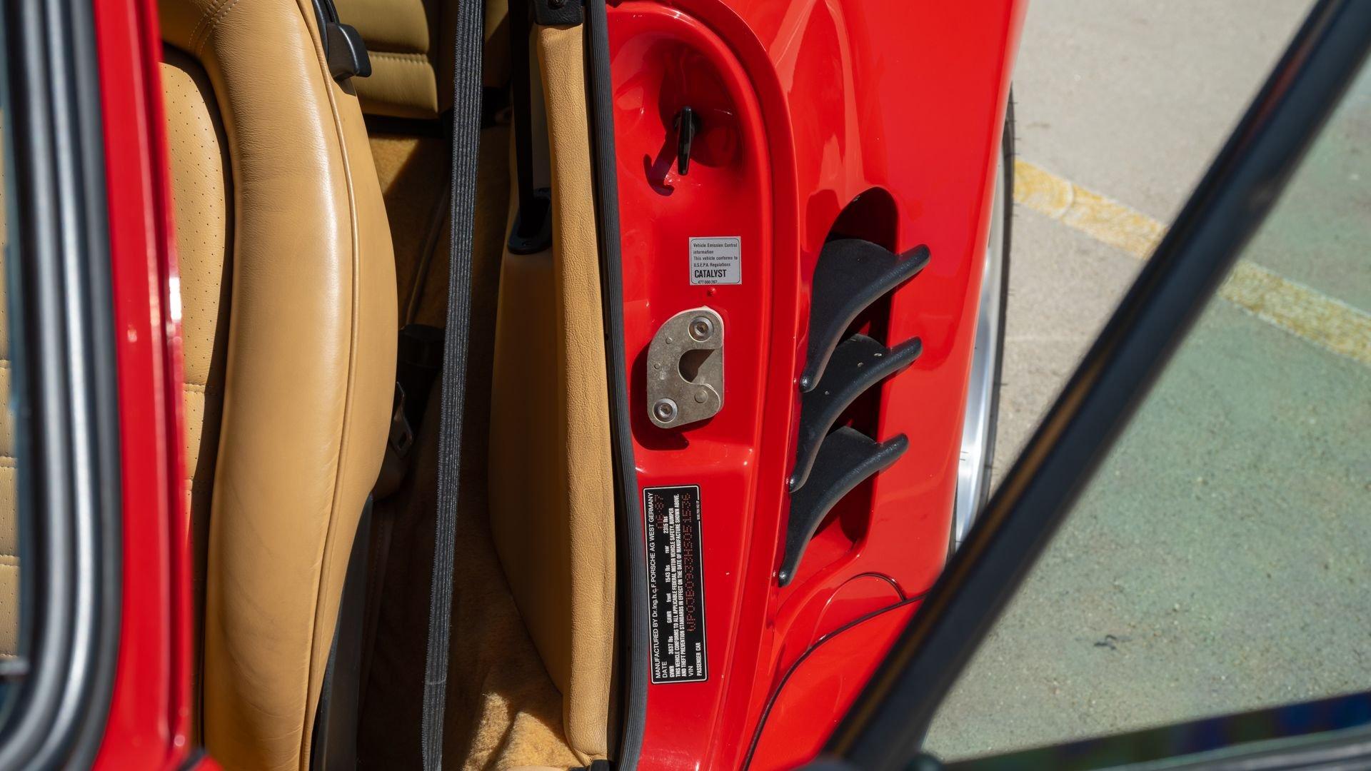 Completed on 15 June 1987 and delivered new through Jim Ellis Porsche of Atlanta, chassis number 51536 was specified in classic Guards Red over Champagne leather and ordered with the coveted M505 Slantnose package, giving the 930 Turbo its dramatic 935-inspired front end, boxed rocker panels, and rear fender intakes. A copy of the original window sticker notes a new price of $86,907 and documents factory options including an electric sunroof, driver lumbar support, Blaupunkt Reno radio, stone guard decals, and a velour-trimmed luggage compartment. One of just 144 U.S.-market Slantnose Turbo Coupes produced for the model year, it retains its matching-numbers 3.3-liter flat-six and four-speed manual transaxle, with correspondence from Porsche Cars North America recording that serial numbers 68H01602 and 77H02366 are original to the car.