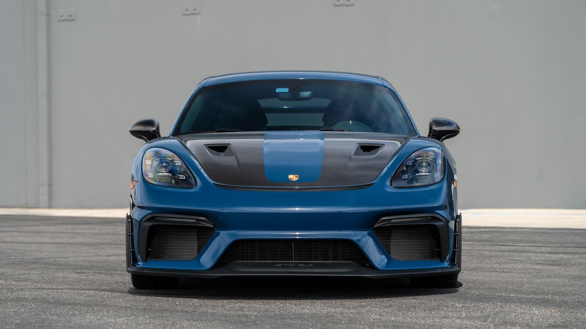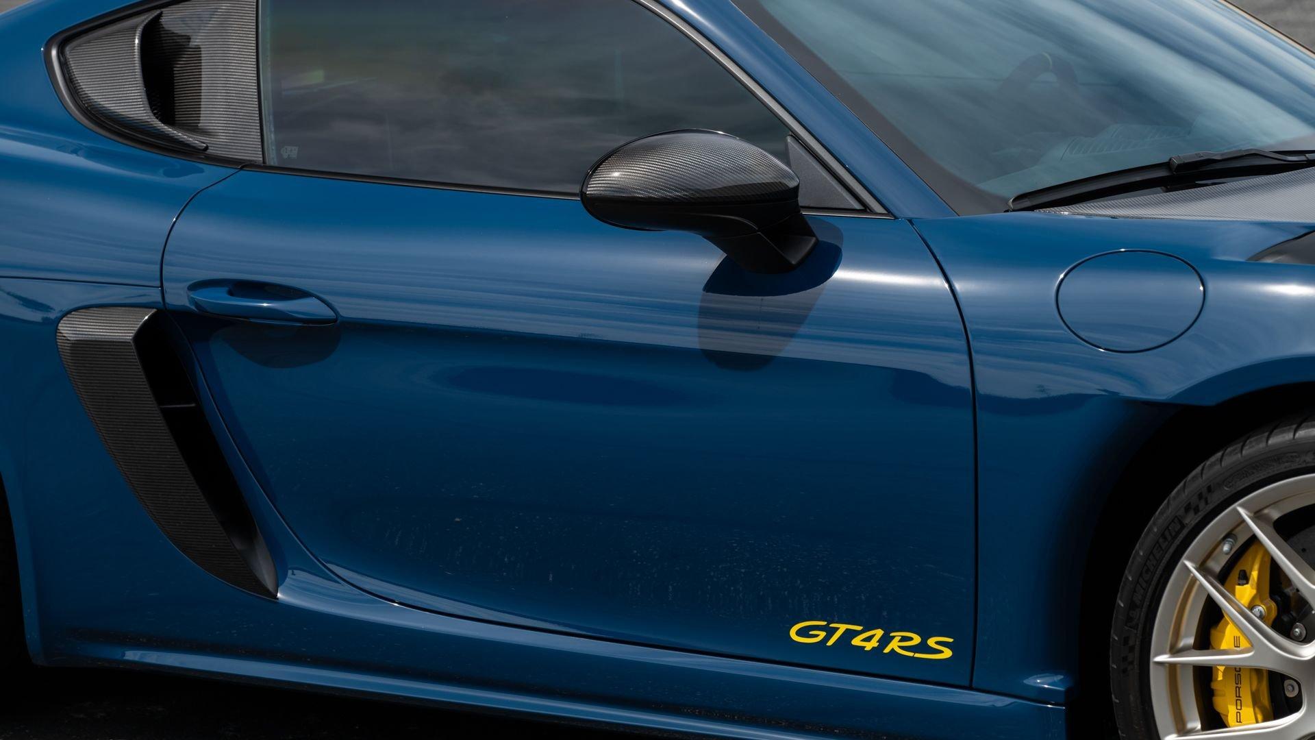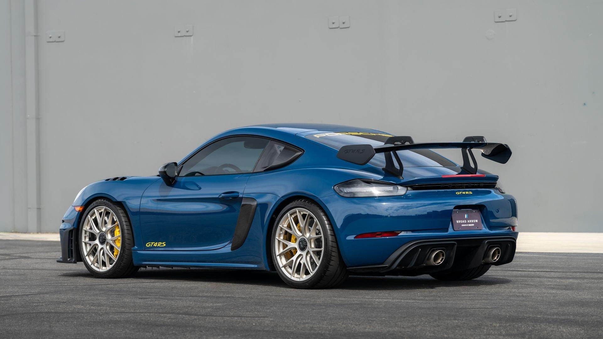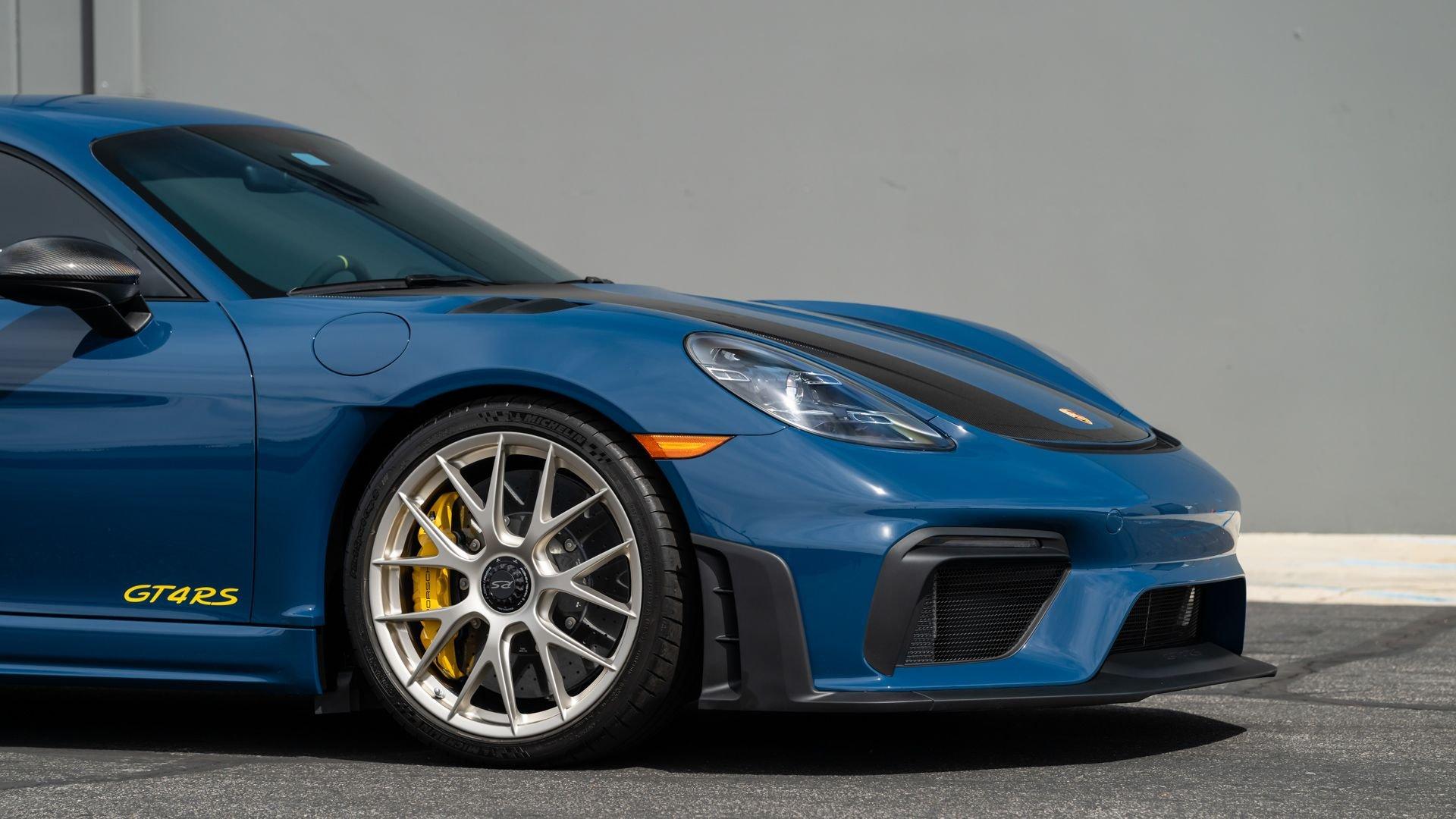 Delivered new to Porsche Fresno, this Cayman GT4 RS is optioned with an incredible $64,000 in factory fitted extras. Most important is the $13,250 Weissach Package with exposed carbon fiber front trunk lid, side air intakes, exterior mirrors, and rear wing. Further factory enhancements include 20-inch forged Magnesium wheels for an additional $15,640 painted in Satin White Gold Metallic, Front Axle Lift, Porsche Ceramic Composite Brakes (PCCB), and more. The striking option sheet is matched by the equally striking Paint to Sample ($14,750) exterior color of azureblue356. The rarely seen PTS hue from Porsche's earliest days is described by Exclusive Manufaktur as a “rich medium blue with subtle greenish undertones” which is smartly matches to a Black leather and Race-Tex interior with Deep Sea Blue Deviated Stitching. This example is further enhanced by a Soul Performance exhaust system (with the factory exhaust system included) providing an intoxicating exhaust note and an additional set of color coordinated Madras-style seat inserts, this Cayman GT4 RS includes delivery items, its original window sticker, a VIN Analytics Report, and a clean CARFAX Vehicle History Report.