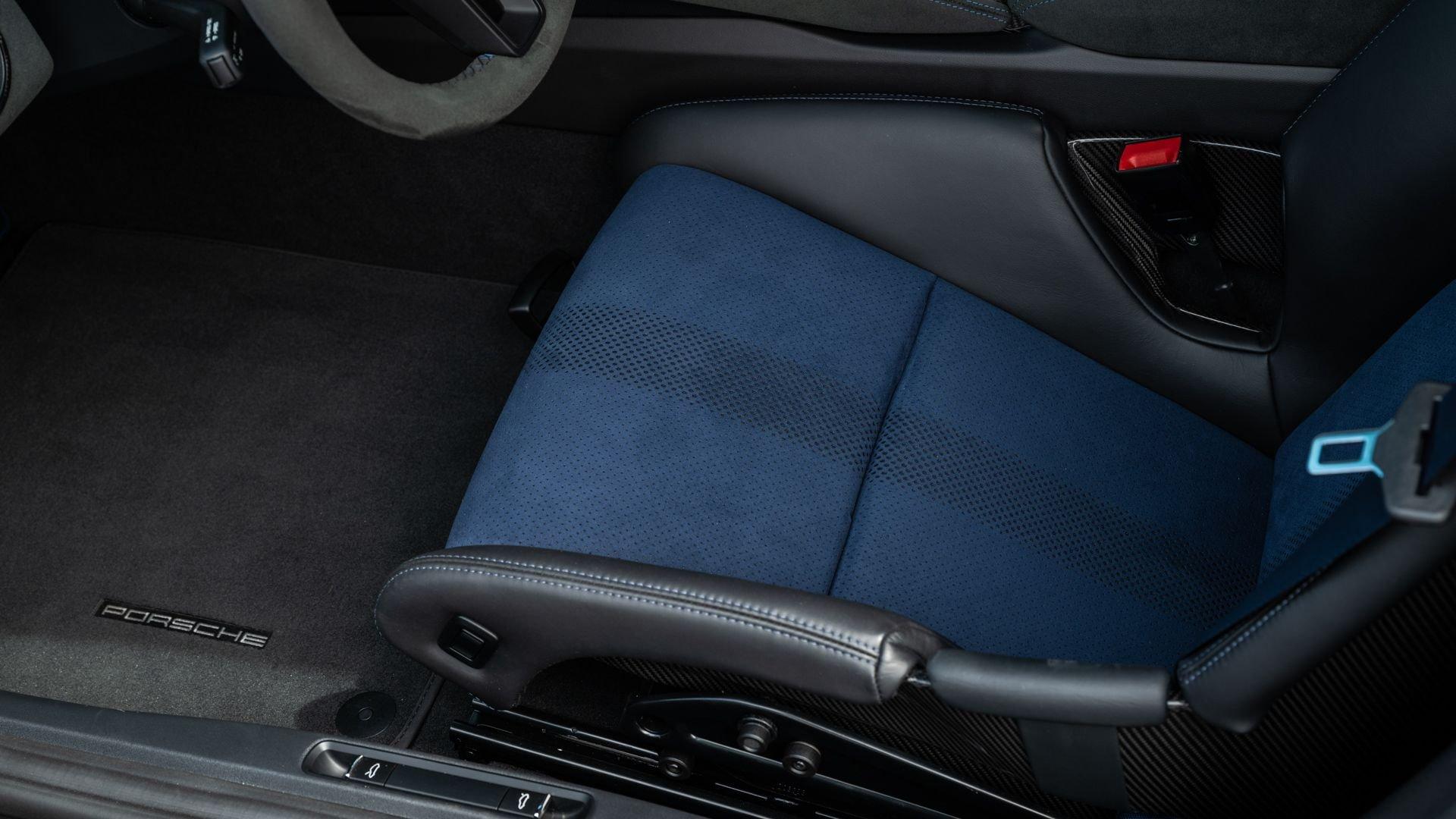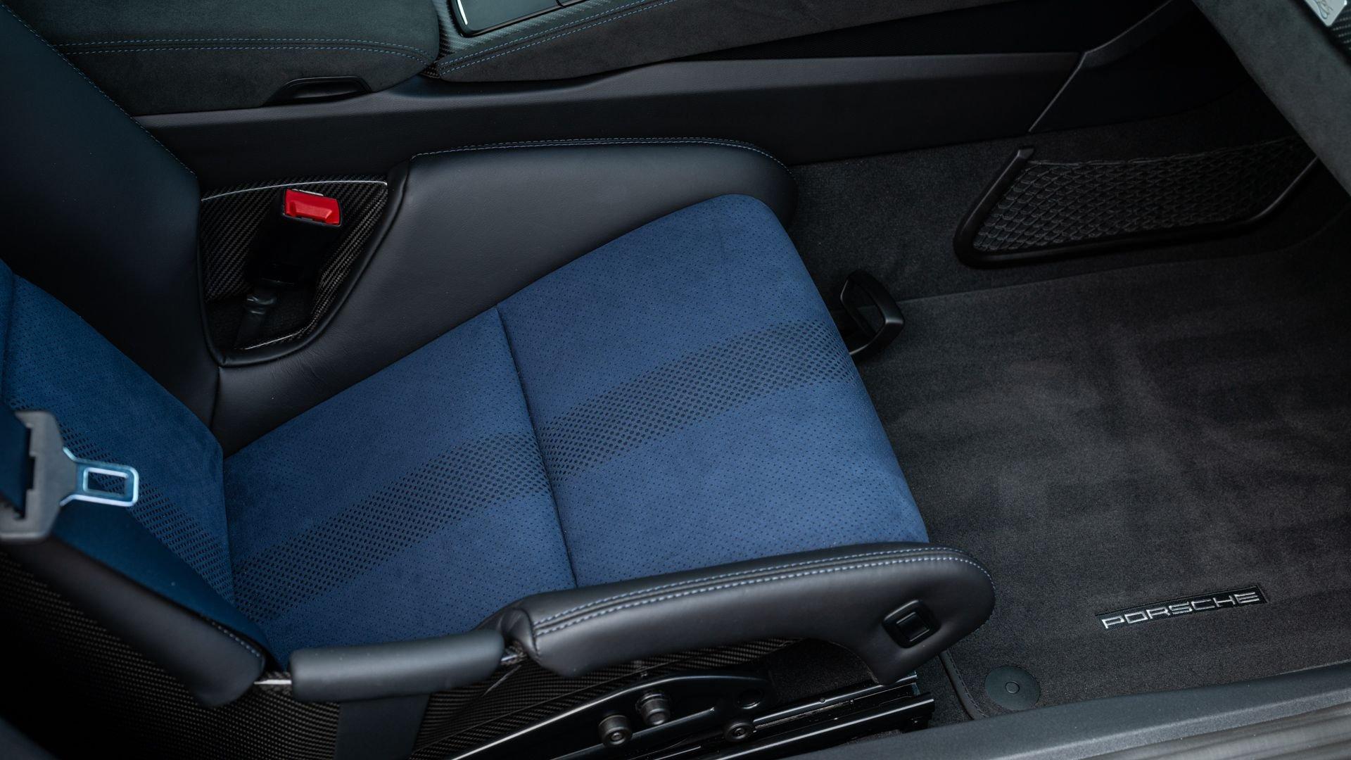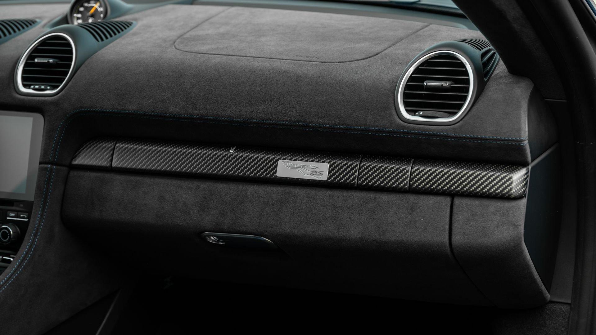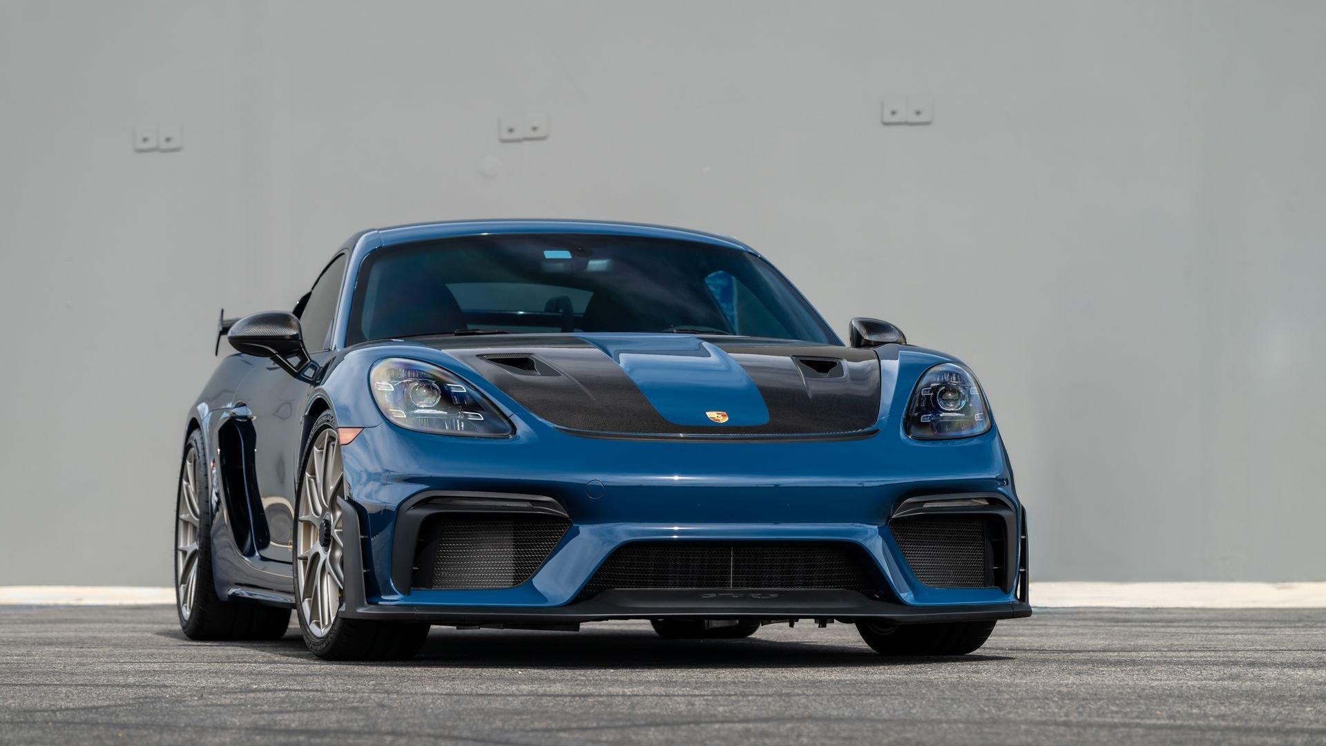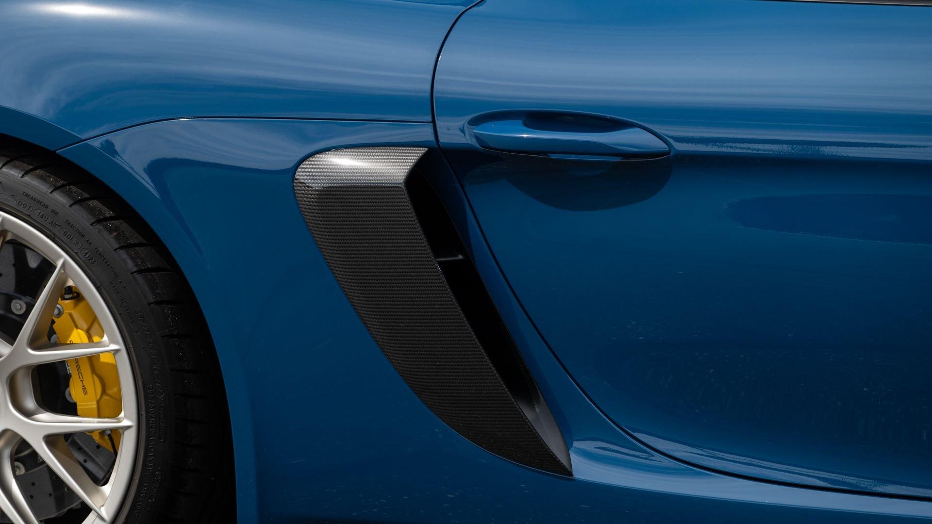 Delivered new to Porsche Fresno, this Cayman GT4 RS is optioned with an incredible $64,000 in factory fitted extras. Most important is the $13,250 Weissach Package with exposed carbon fiber front trunk lid, side air intakes, exterior mirrors, and rear wing. Further factory enhancements include 20-inch forged Magnesium wheels for an additional $15,640 painted in Satin White Gold Metallic, Front Axle Lift, Porsche Ceramic Composite Brakes (PCCB), and more. The striking option sheet is matched by the equally striking Paint to Sample ($14,750) exterior color of azureblue356. The rarely seen PTS hue from Porsche's earliest days is described by Exclusive Manufaktur as a “rich medium blue with subtle greenish undertones” which is smartly matches to a Black leather and Race-Tex interior with Deep Sea Blue Deviated Stitching. This example is further enhanced by a Soul Performance exhaust system (with the factory exhaust system included) providing an intoxicating exhaust note and an additional set of color coordinated Madras-style seat inserts, this Cayman GT4 RS includes delivery items, its original window sticker, a VIN Analytics Report, and a clean CARFAX Vehicle History Report.