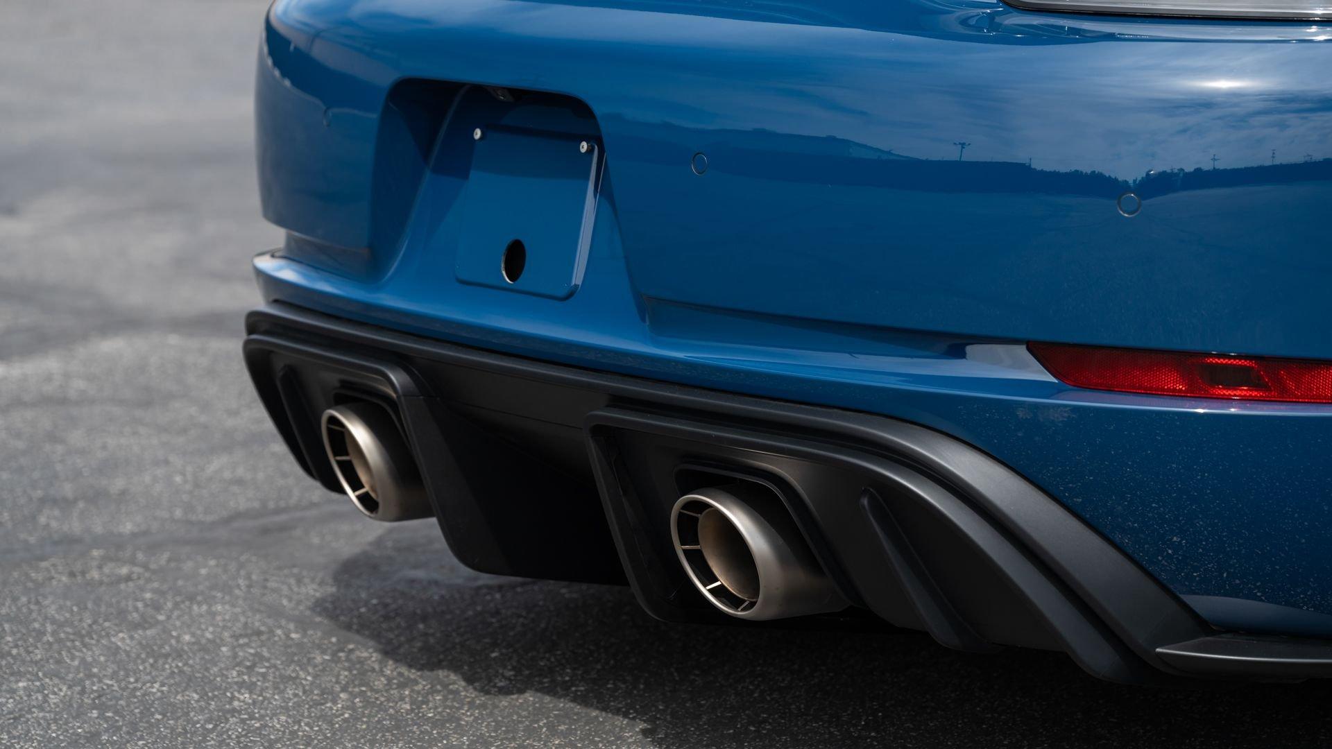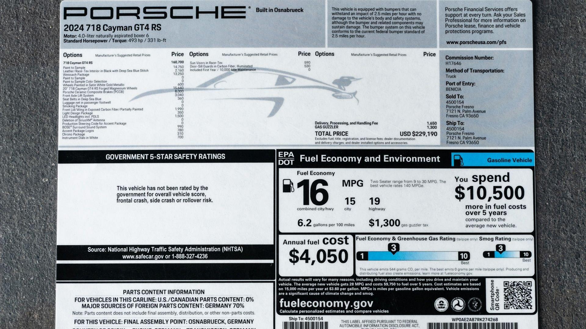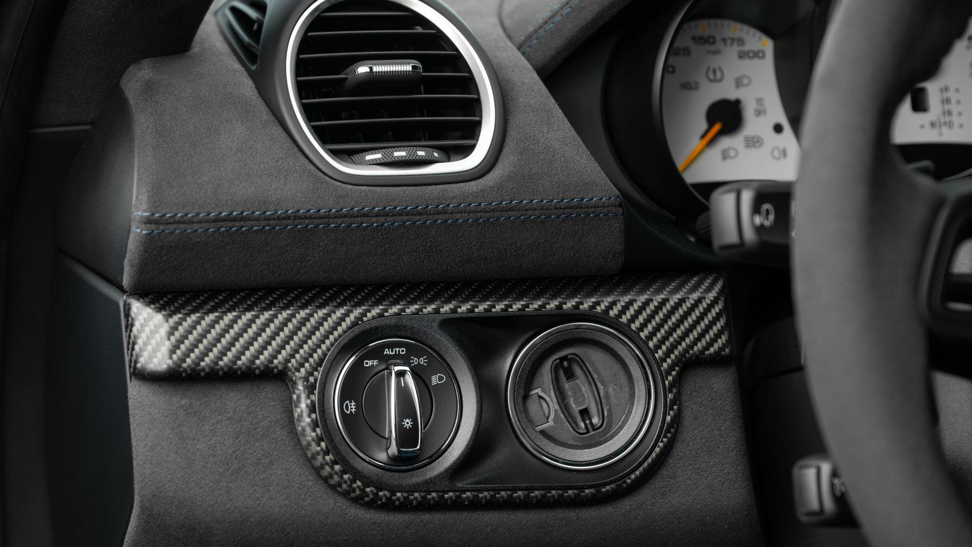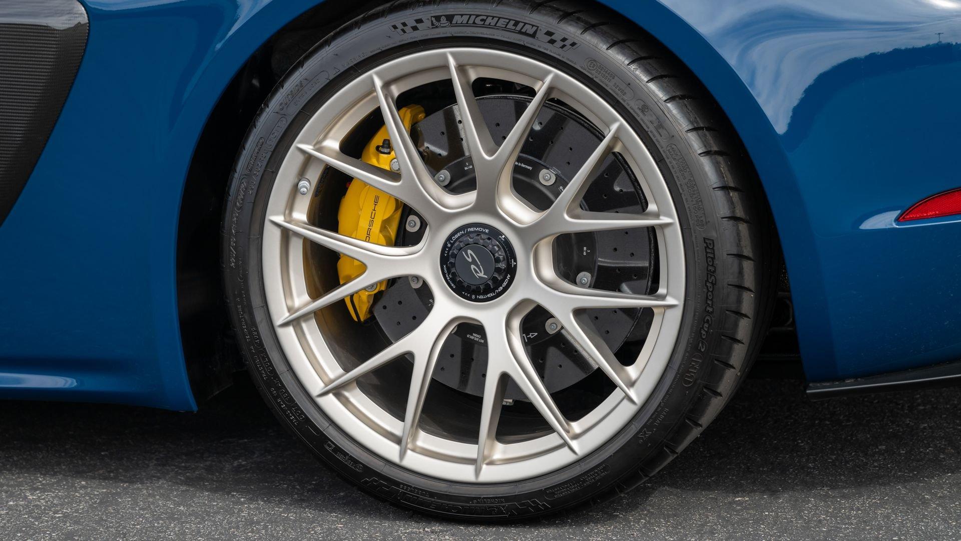 Delivered new to Porsche Fresno, this Cayman GT4 RS is optioned with an incredible $64,000 in factory fitted extras. Most important is the $13,250 Weissach Package with exposed carbon fiber front trunk lid, side air intakes, exterior mirrors, and rear wing. Further factory enhancements include 20-inch forged Magnesium wheels for an additional $15,640 painted in Satin White Gold Metallic, Front Axle Lift, Porsche Ceramic Composite Brakes (PCCB), and more. The striking option sheet is matched by the equally striking Paint to Sample ($14,750) exterior color of azureblue356. The rarely seen PTS hue from Porsche's earliest days is described by Exclusive Manufaktur as a “rich medium blue with subtle greenish undertones” which is smartly matches to a Black leather and Race-Tex interior with Deep Sea Blue Deviated Stitching. This example is further enhanced by a Soul Performance exhaust system (with the factory exhaust system included) providing an intoxicating exhaust note and an additional set of color coordinated Madras-style seat inserts, this Cayman GT4 RS includes delivery items, its original window sticker, a VIN Analytics Report, and a clean CARFAX Vehicle History Report.